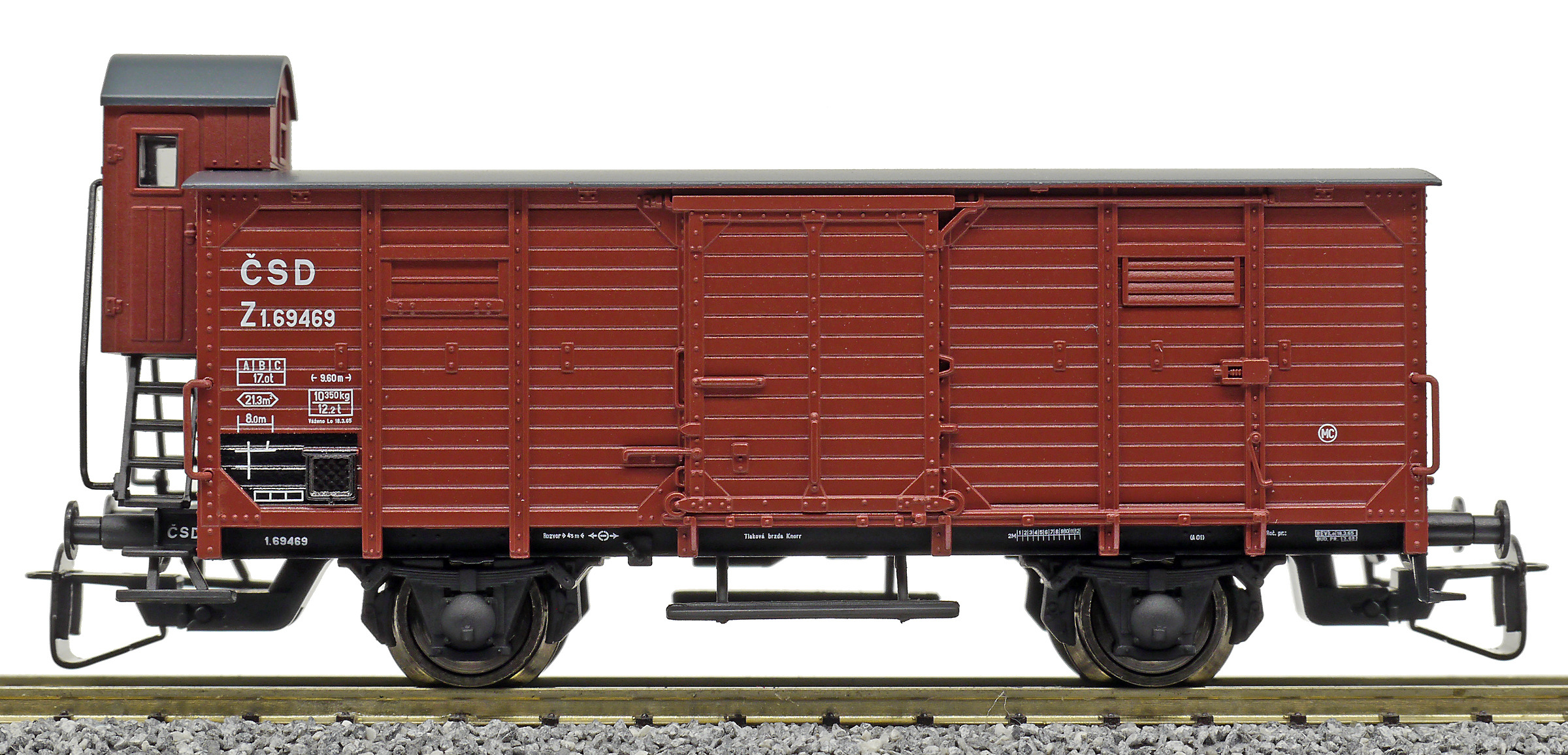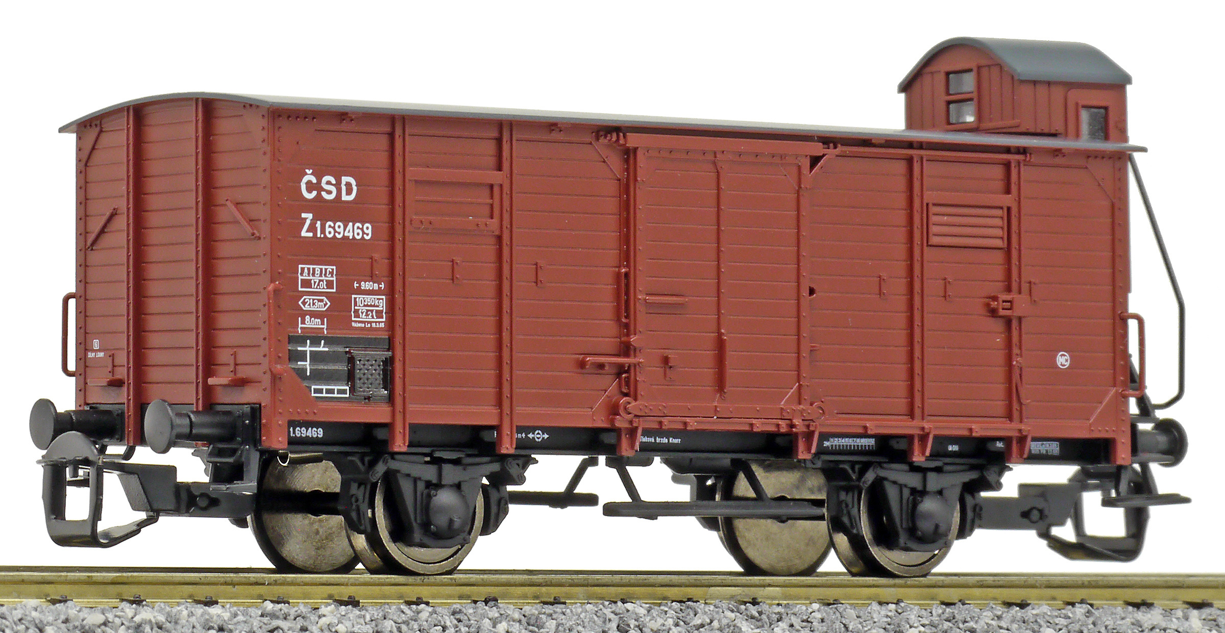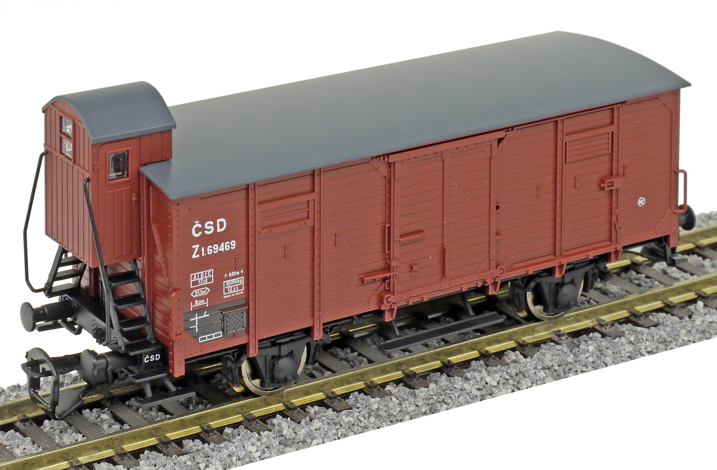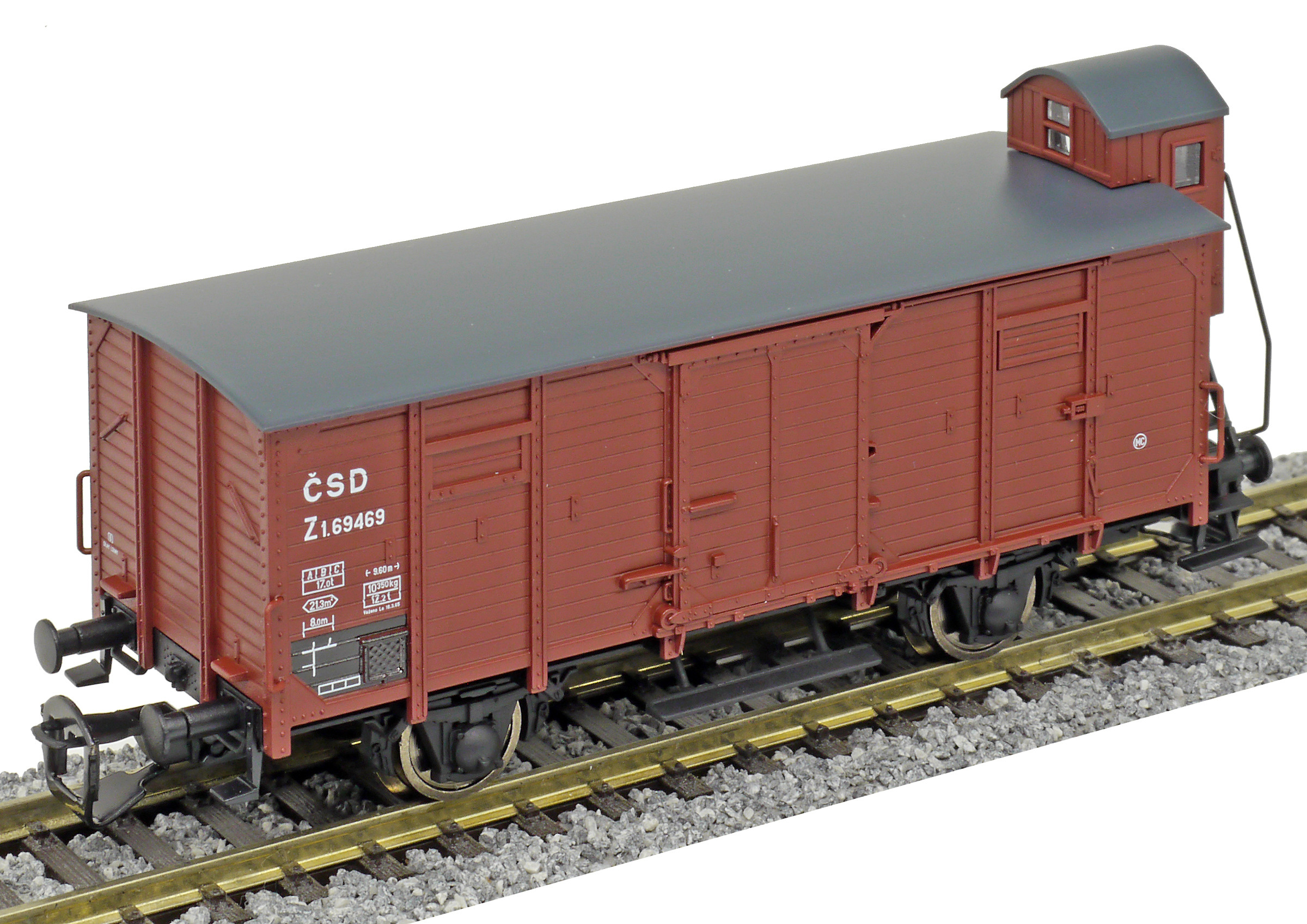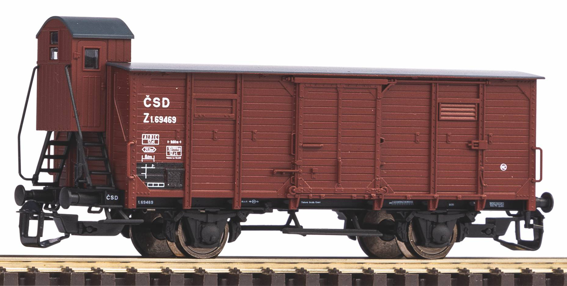 | krytý nákladní vůz červenohnědý s černou střechou a s brzdařskou budkou |