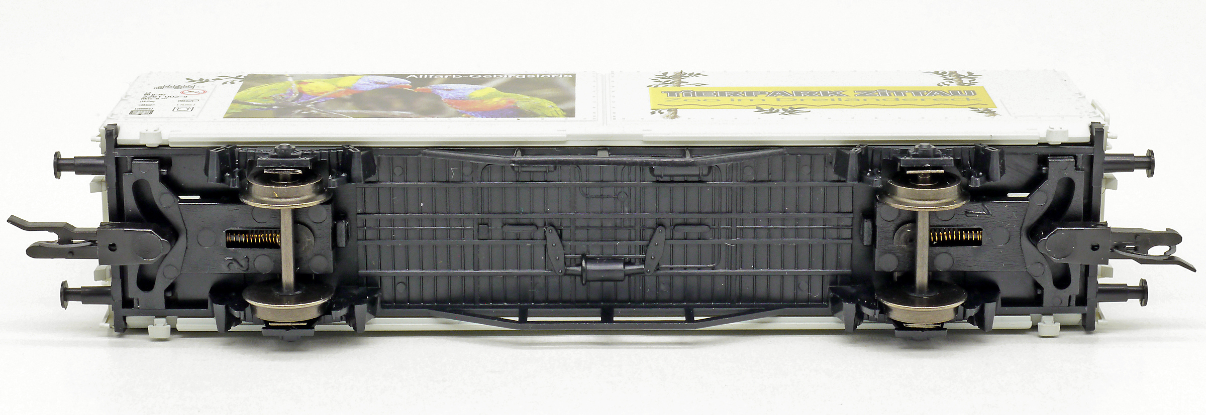 | krytý nákladní vůz s posuvnými stěnami a s reklamním potiskem „Mein Zoo” |