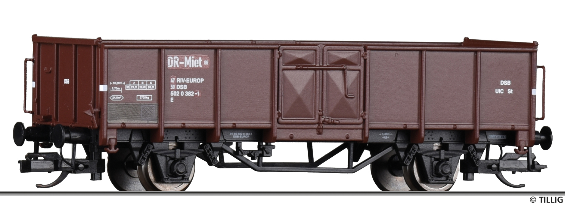 | otevřený nákladní vůz červenohnědý se záplatami, DR zapůjčen od DSB |