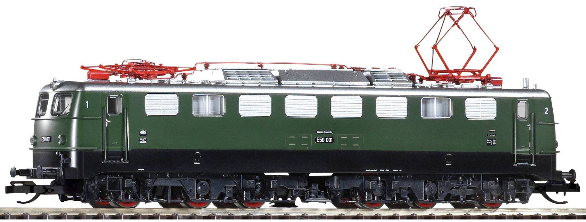 | elektrická lokomotiva tmavě zelená s černým rámem, stříbrná střecha, červené pantografy |