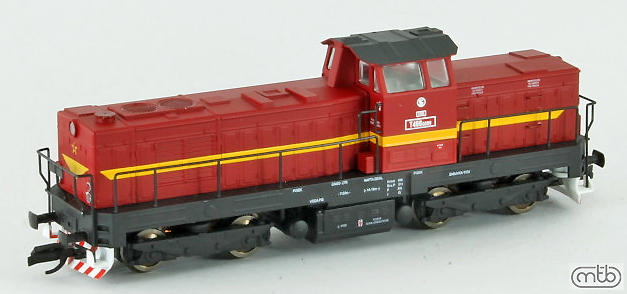 | dieselová lokomotiva v červeném továrním nátěru s černým rámem a pojezdem |