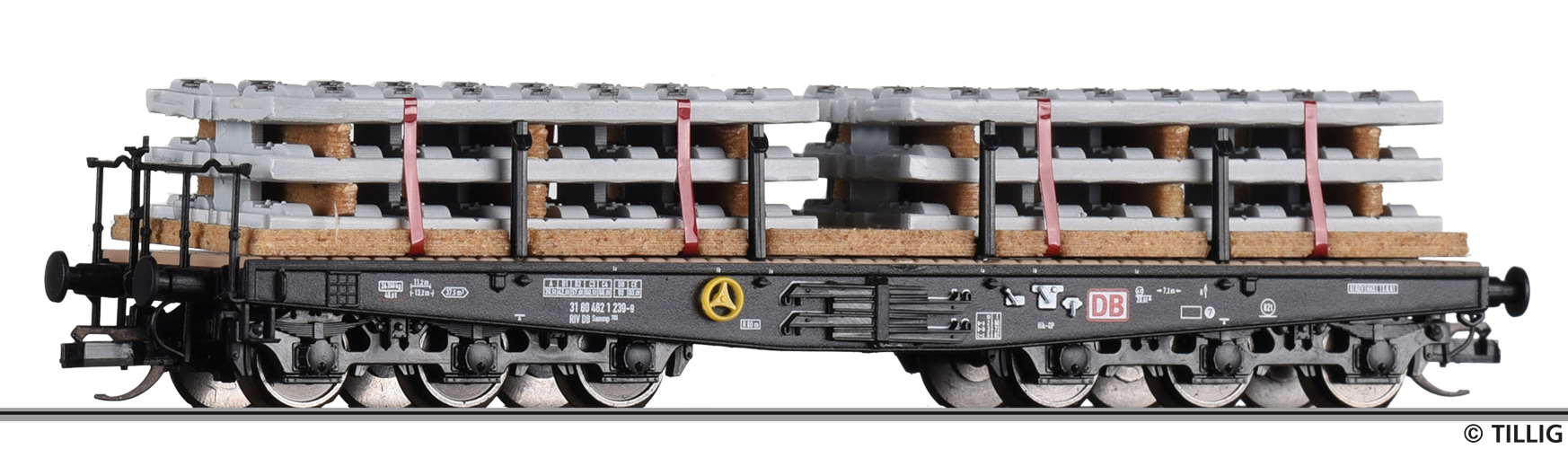 | nákladní plošinový vůz černý ložený betonovými díly „Feste Fahrbahn“ |