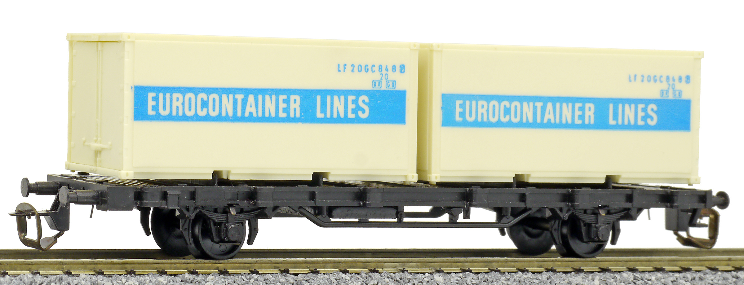 | nákladní plošinový vůz černý se dvěma 20' kontejnery „EUROCONTAINER LINES“ |