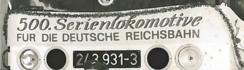 | elektrická lokomotiva červená s transparentem „500. Serienlokomotive für die DEUTSCHE REICHSBAHN“ |