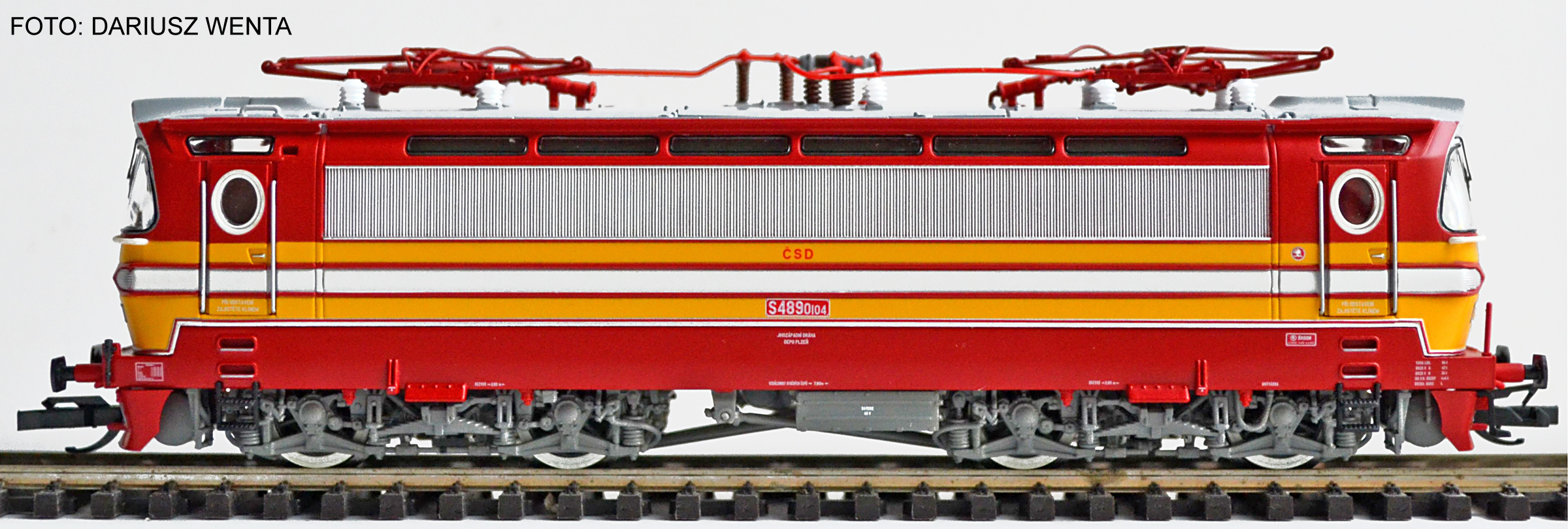 Popis   elektrická lokomotiva v barevné kombinaci červená-žlutá, šedá střecha