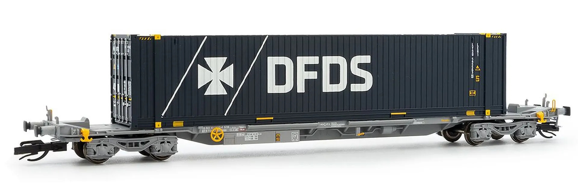| kontejnerový vůz „IFA” šedý ložený 45' kontejnerem „DFDS” |