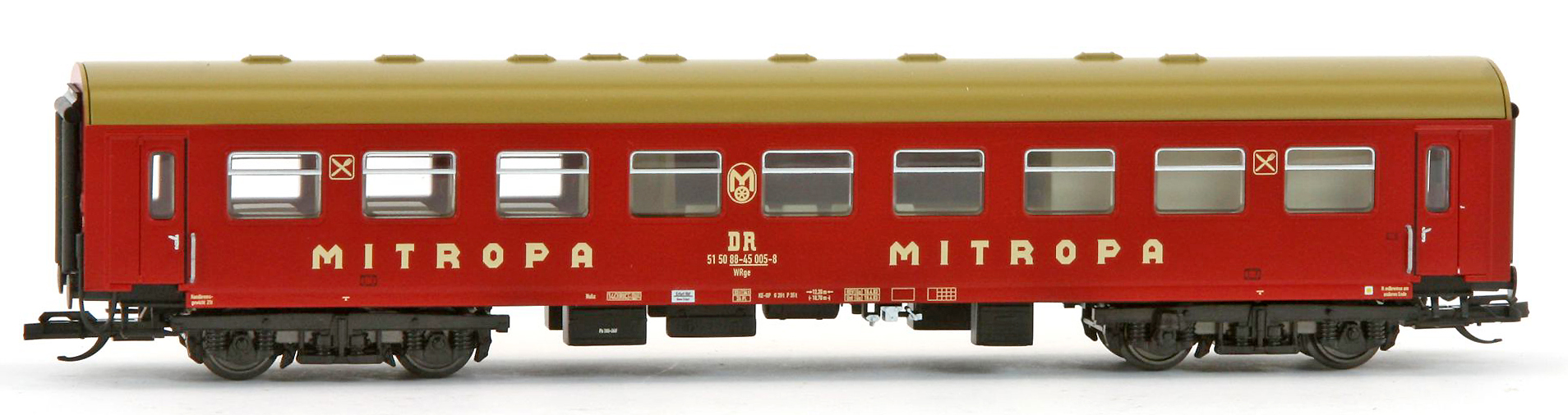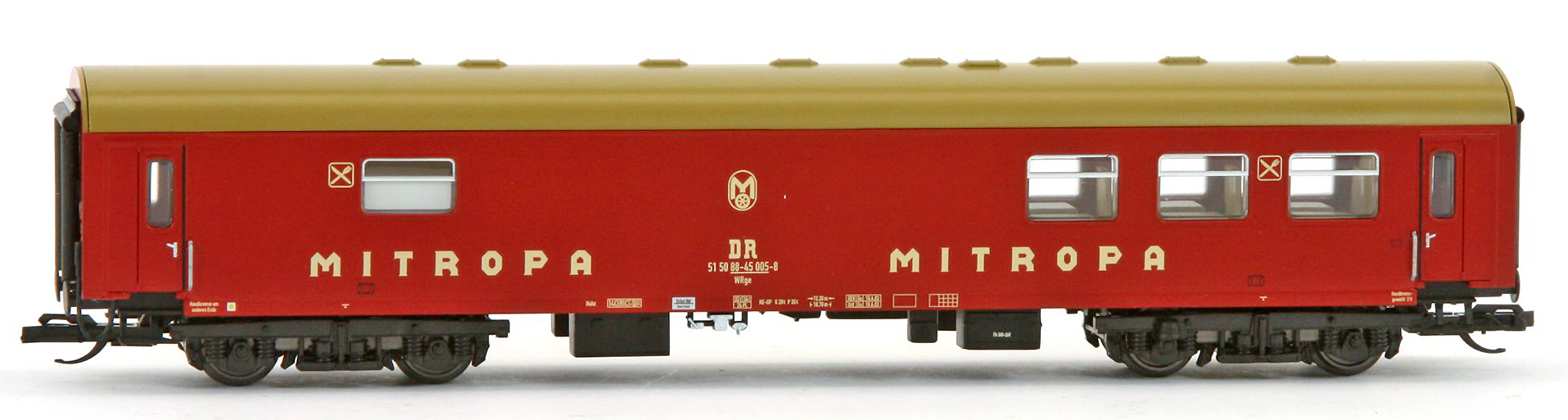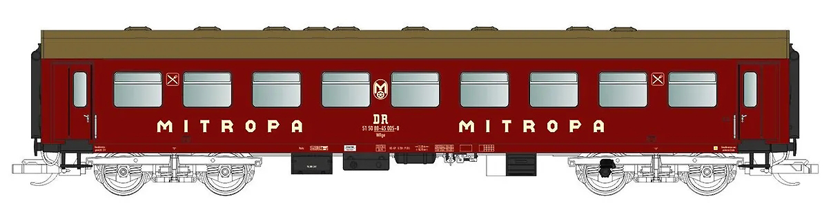 | rekonstruovaný jídelní vůz tmavě červený s rezavou střechou „Mitropa“ |