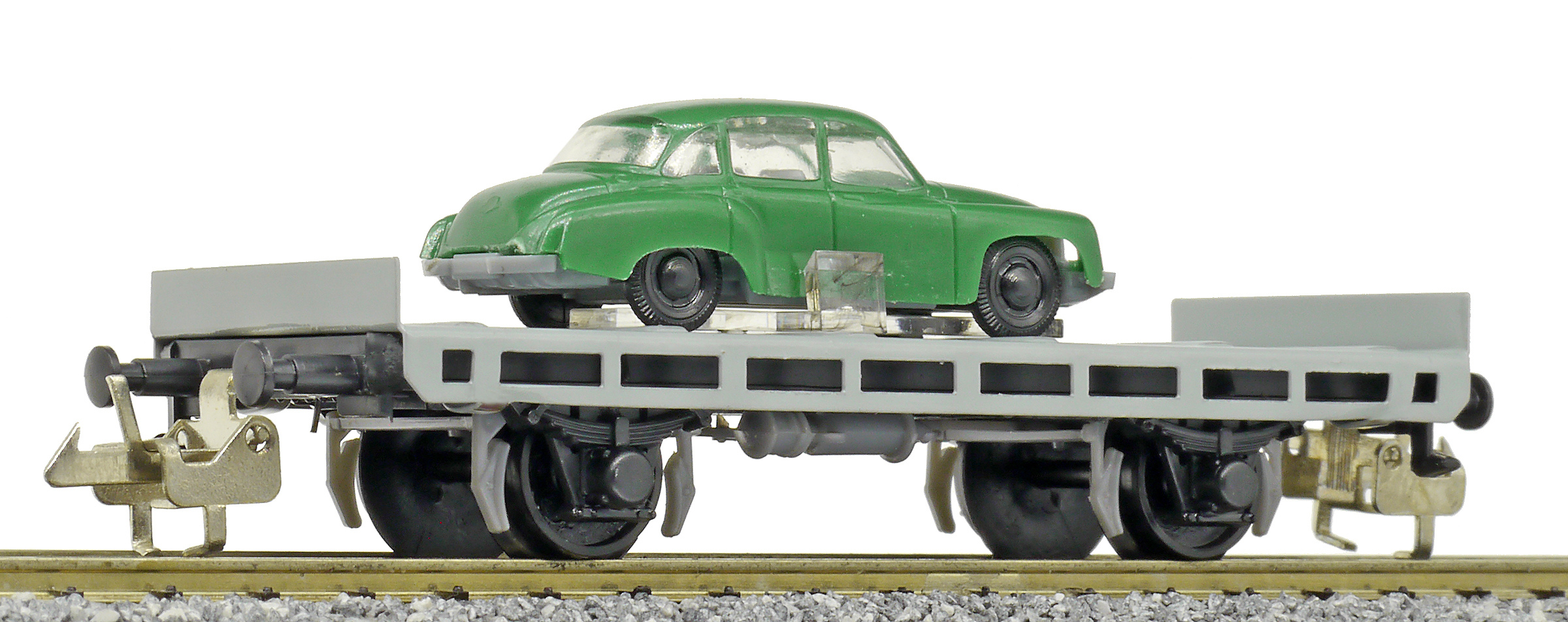 Popis   plošinový nákladní vůz s nákladem auta „Wartburg“, bez popisu