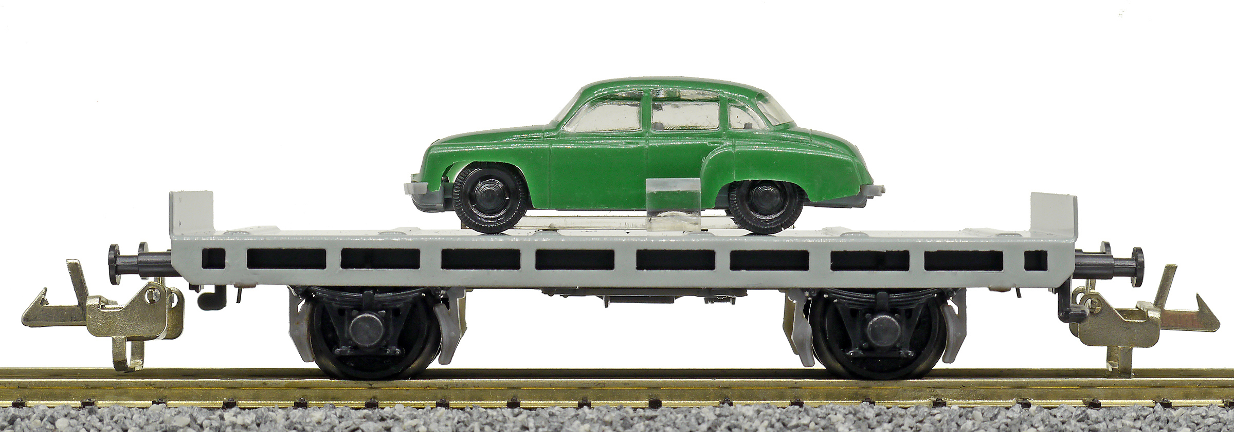 Popis   plošinový nákladní vůz s nákladem auta „Wartburg“, bez popisu