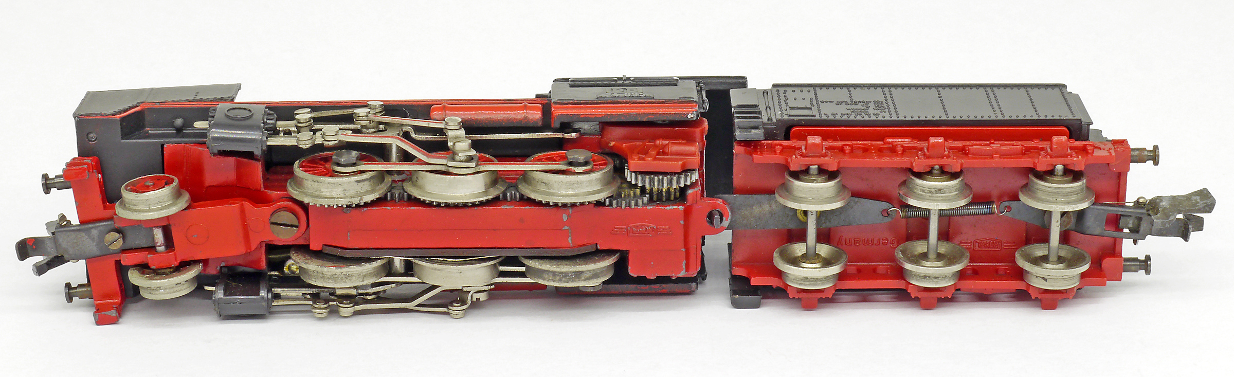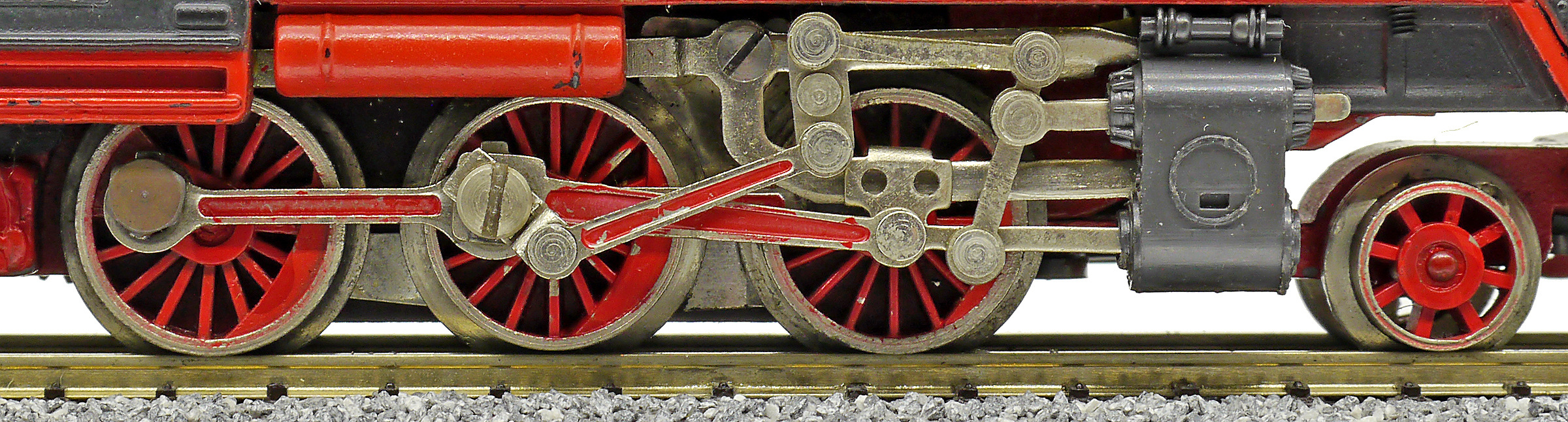 Popis   parní lokomotiva černá s červeným pojezdem a s kouřovými plechy