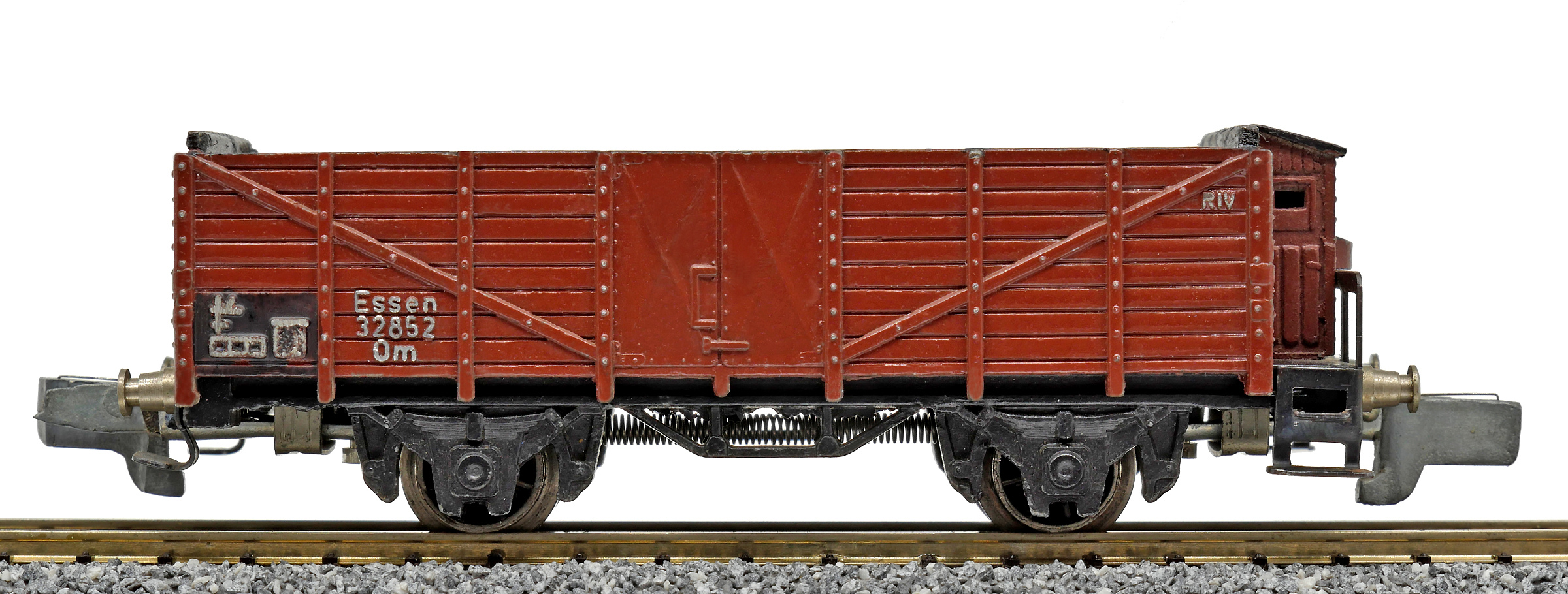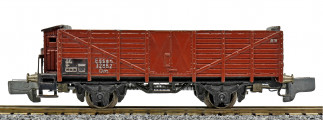 | otevřený nákladní vůz červenohnědý s brzdařskou budkou |