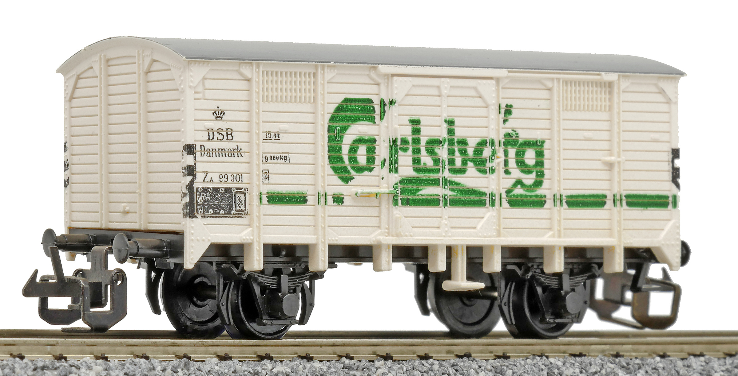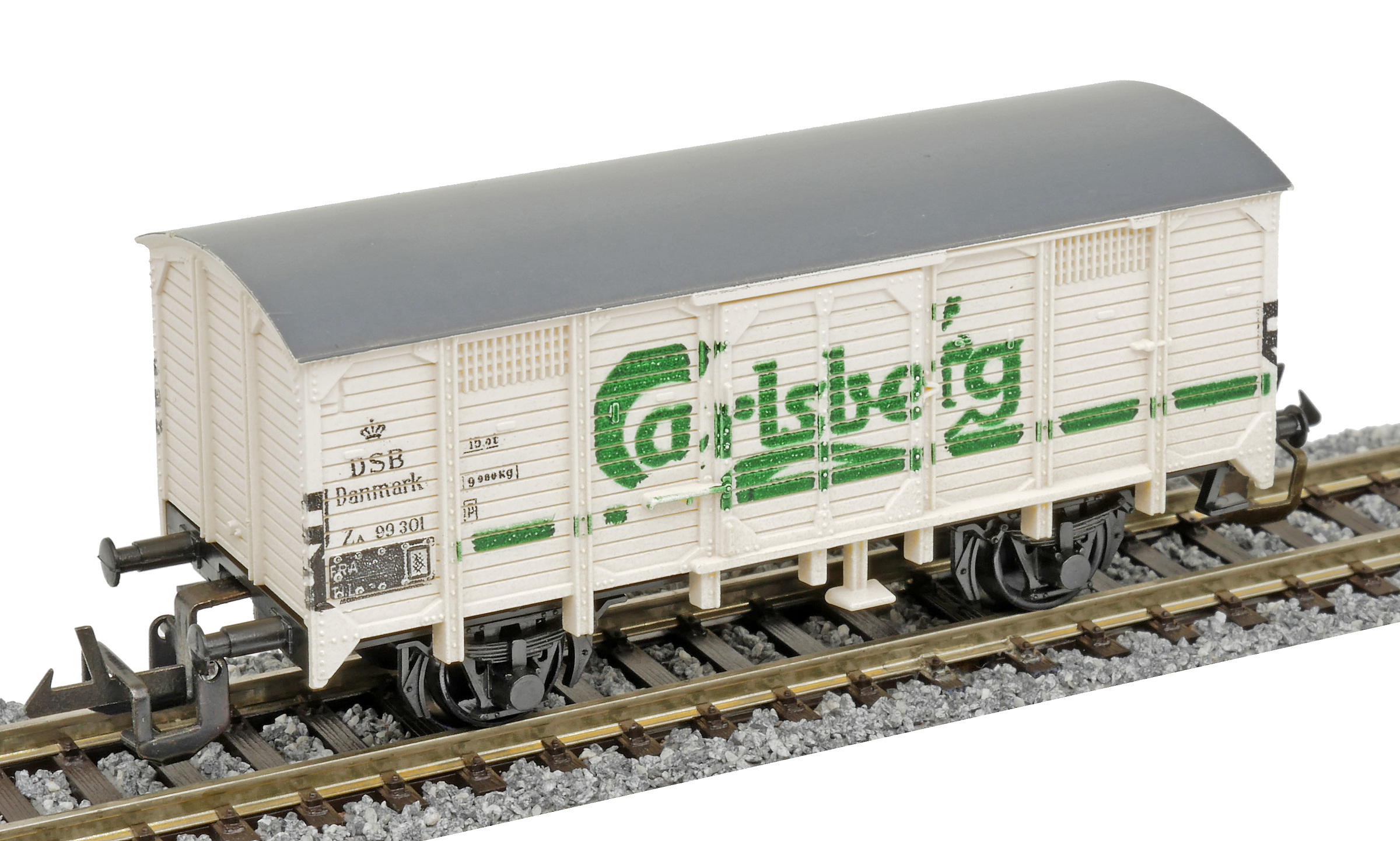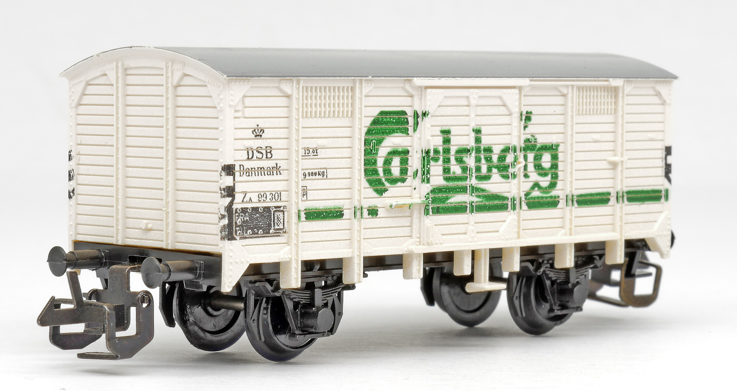 | krytý nákladní vůz bílý s šedou střechou „Carlsberg“ |