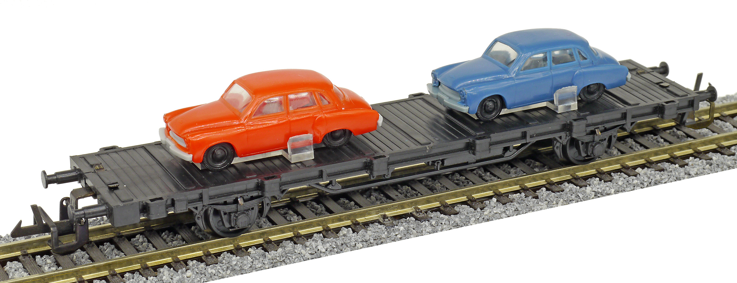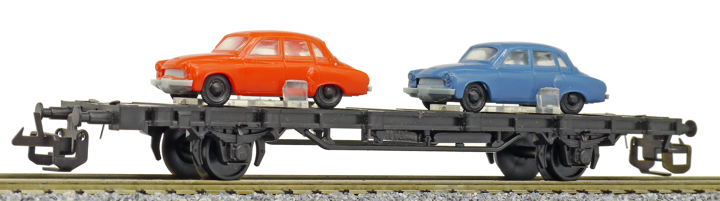 | Nákladní plošinový černý s nákladem dvou osobních automobilů Wartburg |