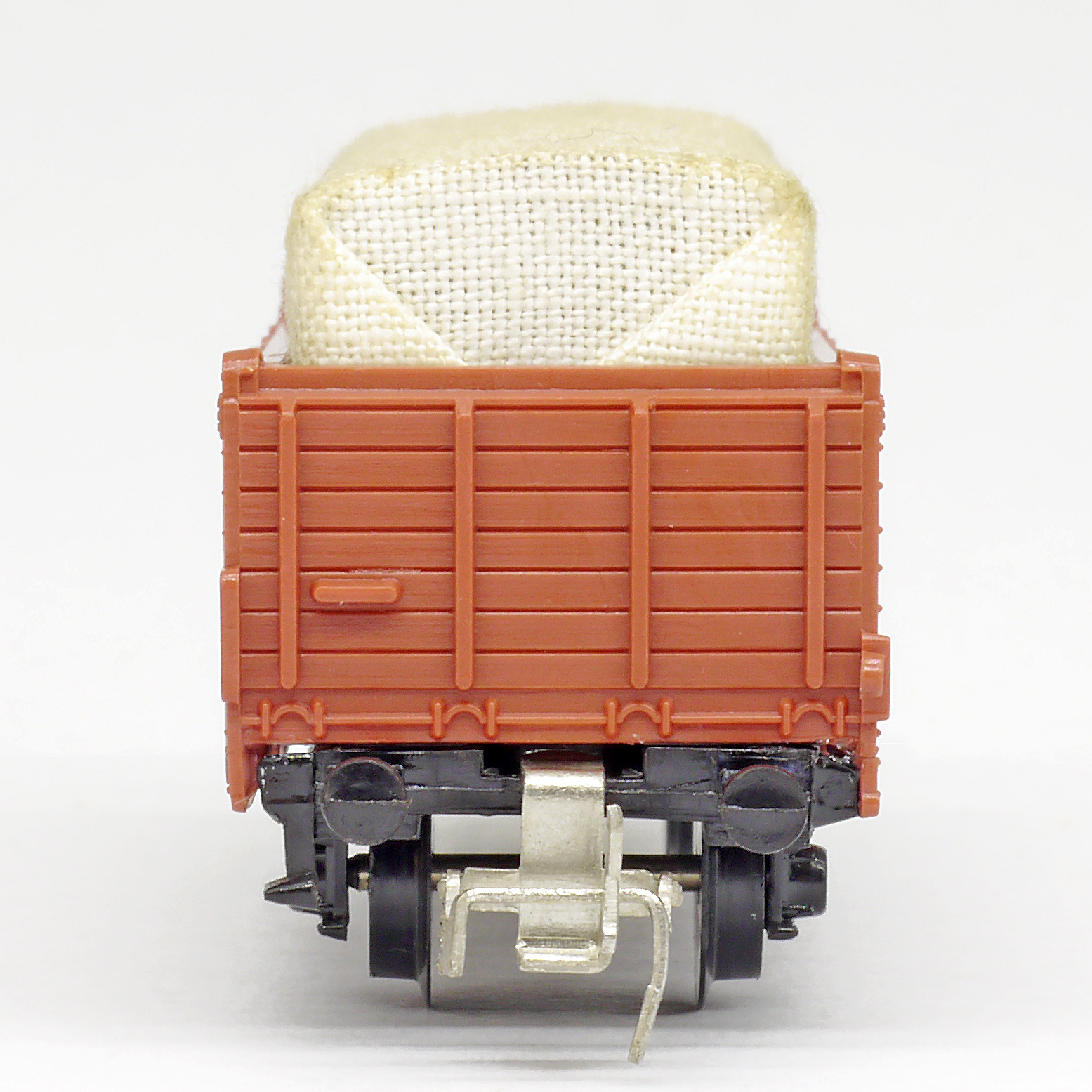 | otevřený nákladní vůz červenohnědý nebo zelený s plachtou |
