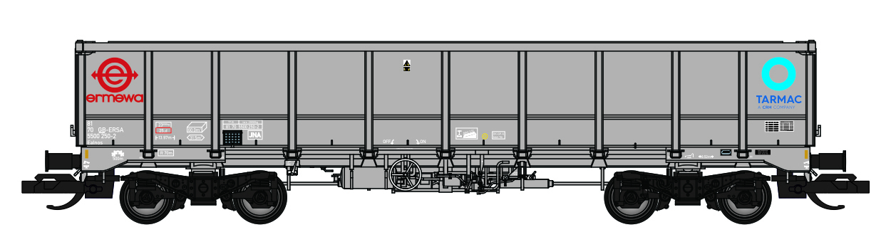 | vysokostěnný nákladní vůz šedý s logem „Ermewa-Tarmac“ |