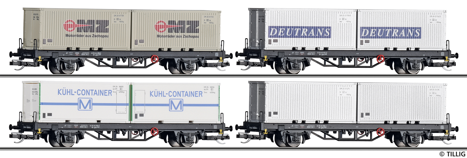 | set čtyř plošinových vozů ložených kontejnery 20' |
