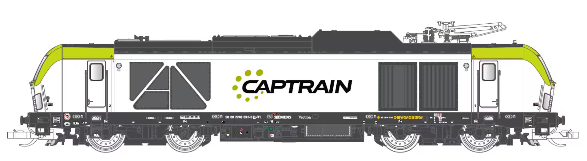 | dieselová/elektrická lokomotiva bílá-šedá s potiskem „Captrain“ |