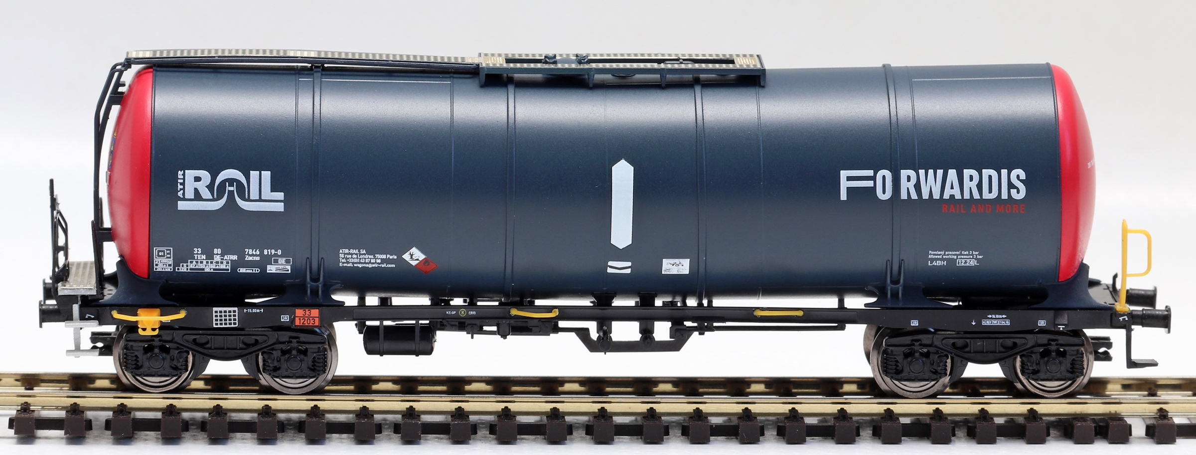 | kotlový vůz tmavě šedý-vínově červená čela s logy „ATIR-RAIL“ a „FORWARDIS“ |