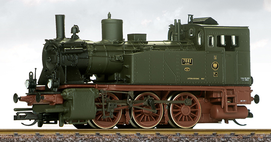 | parní lokomotiva tmavě zelená, černá dýmnice černá s červeným pojezdem |