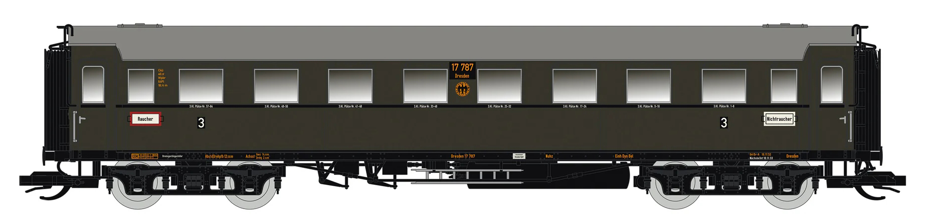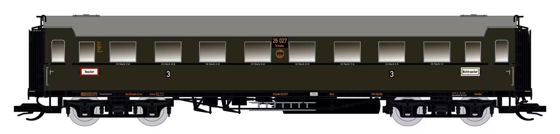 | oddílový osobní vůz tmavě zelený s šedou střechou 3. tř. |
