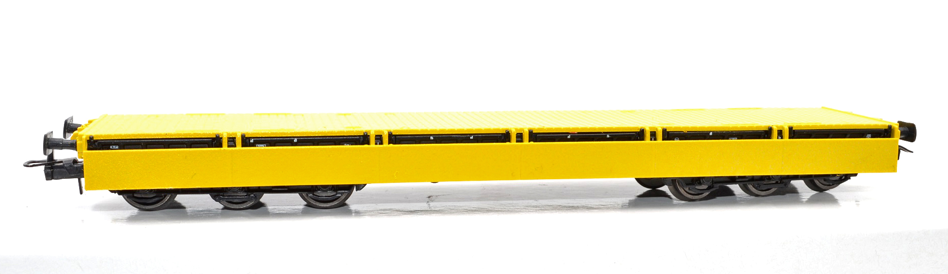 Popis   nízkostěnný nákladní vůz žlutý se sklopenými bočnicemi „Bahnbau Gruppe“