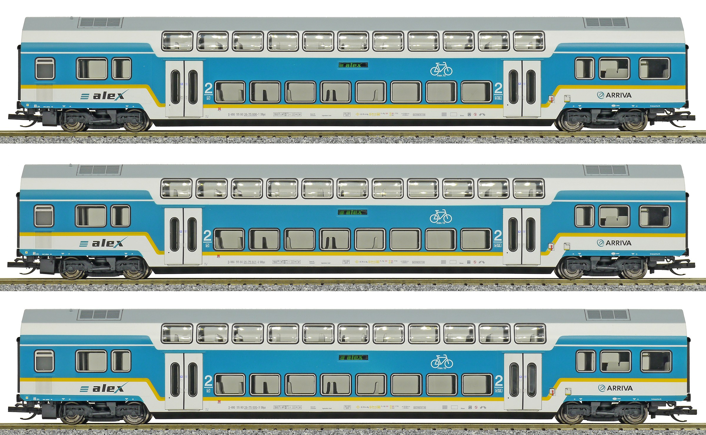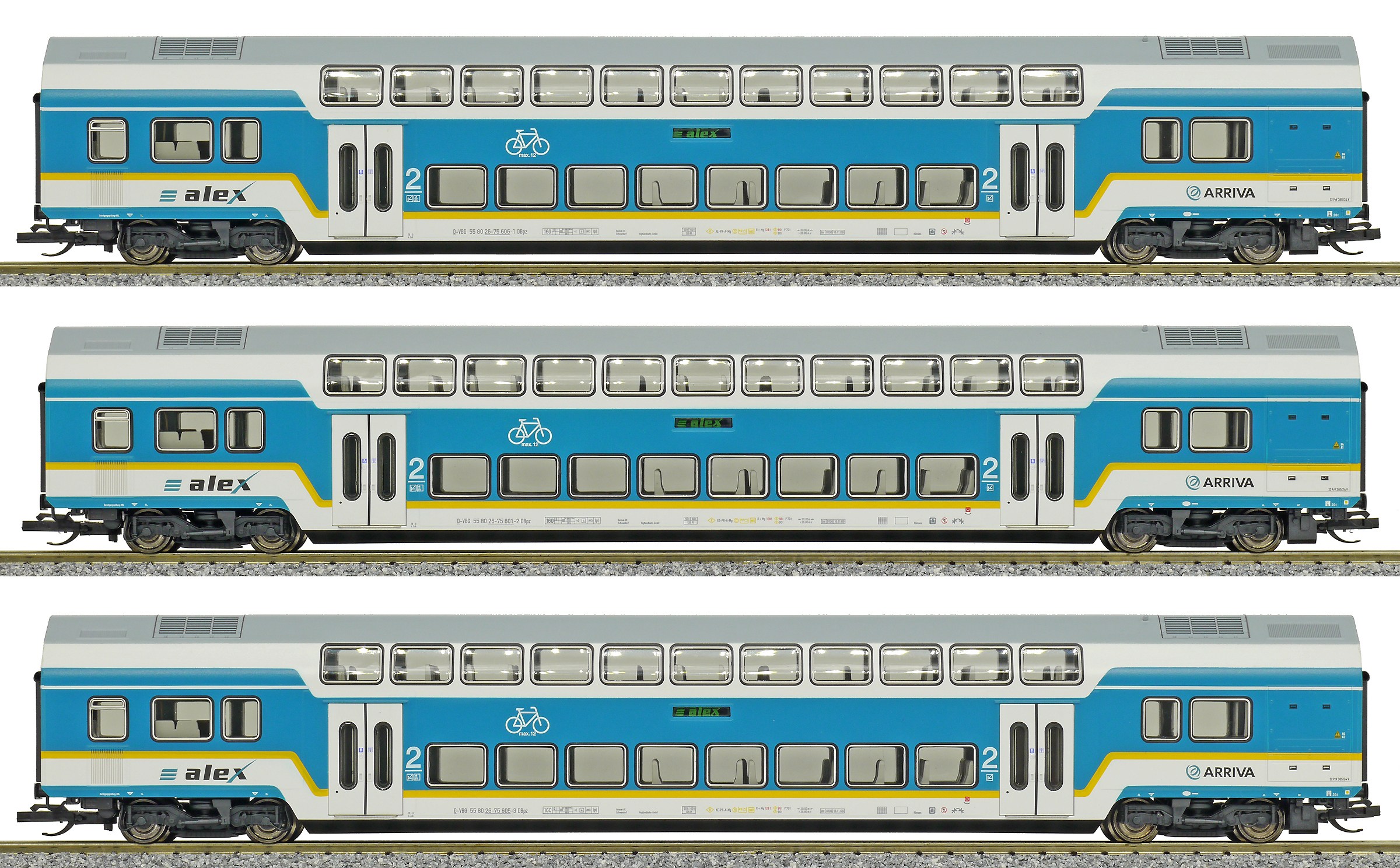 | set tří patrových vozů v barevném schematu „alex“, SET 1 |