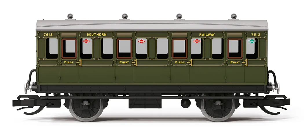 | osobní vůz tmavě zelený se světle šedou střechou „First Class Coach“ |