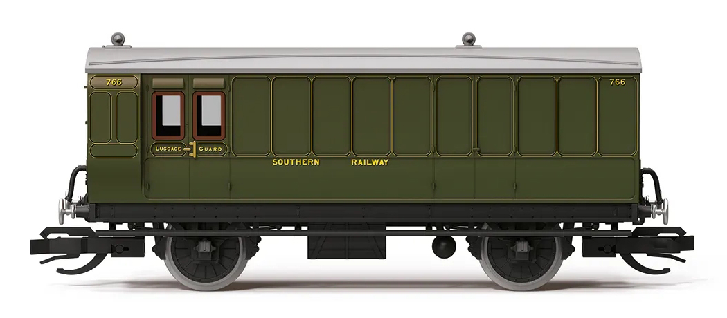 | osobní vůz tmavě zelený se světle šedou střechou „Passenger Brake Coach“ |