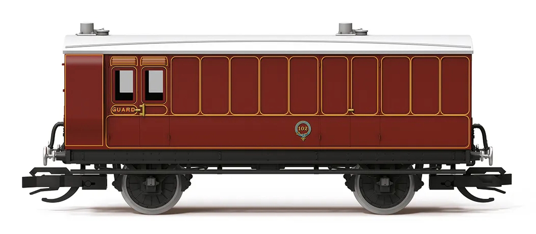 | osobní vůz tmavě červený se světle šedou střechou „Passenger Brake Coach“ |