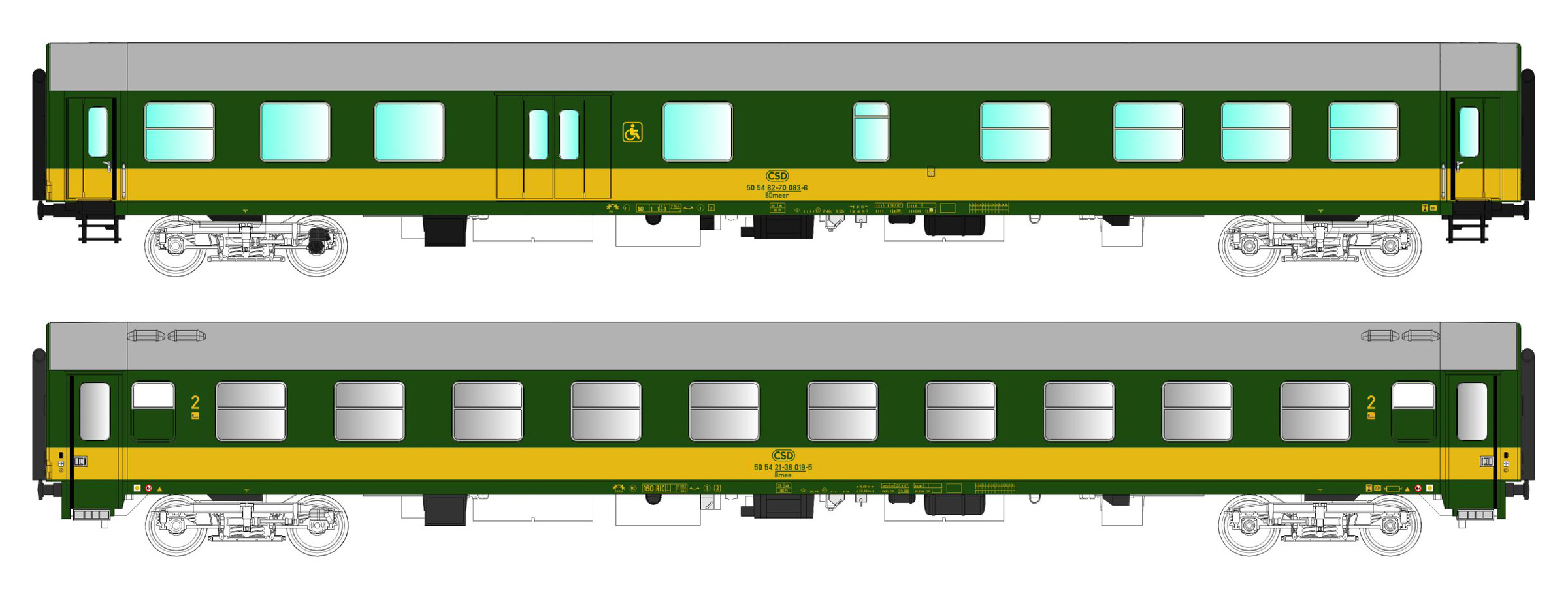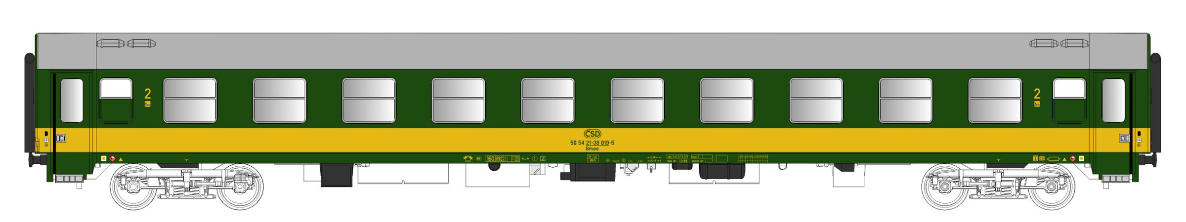 | rychlíkový vůz zelený se žlutým pruhem a šedou střechou 2. tř. |