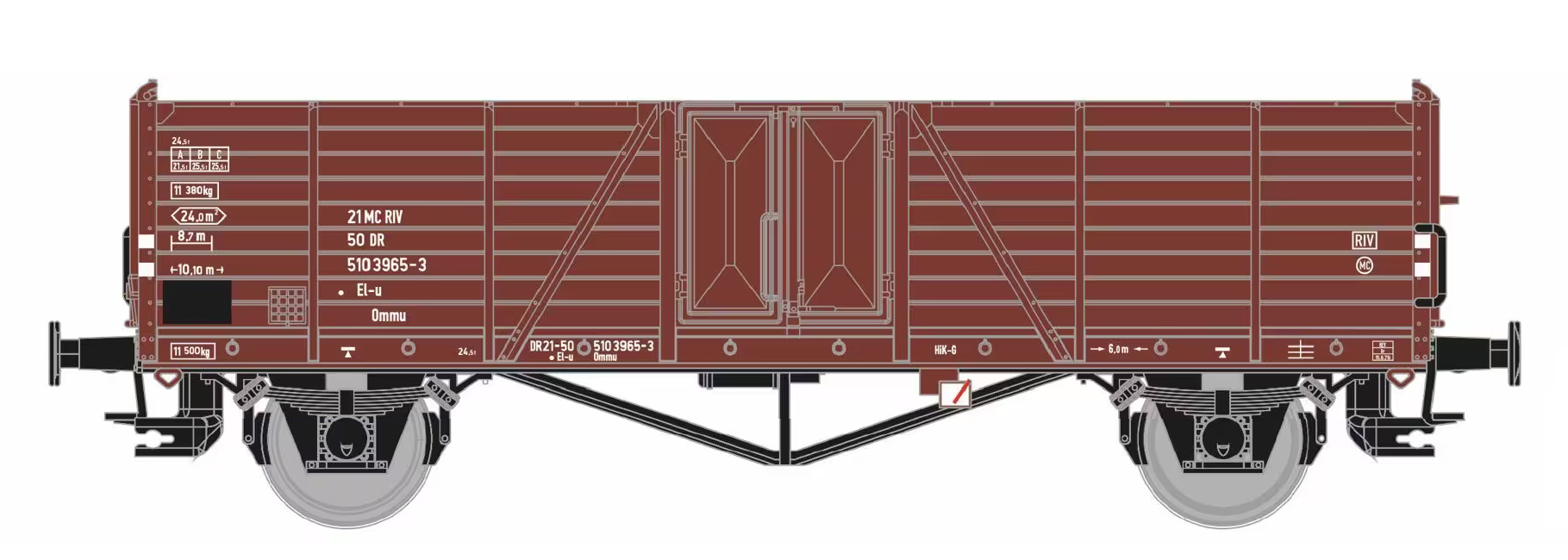 | • 21 50 510 3965-3 | → | nákladní, nezávislé nápravy, pevný rozchod, ve vlastnictví železniční správy, RIV, PPV |