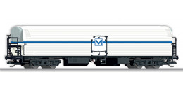 | nákladní chladící vůz bílý s modrým proužkem a logem „M“ |