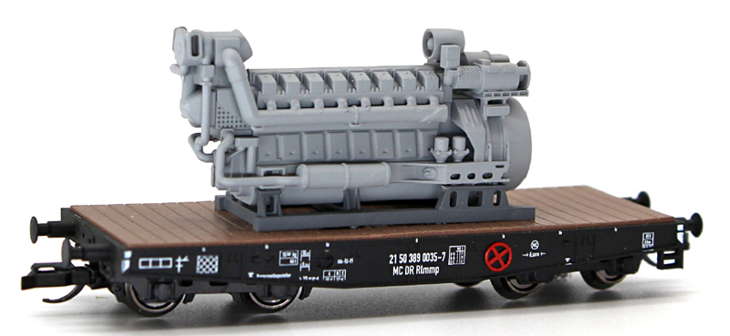 | plošinový nákladní vůz s nákladem motoru 5D49 z lokomotivy BR 130 |