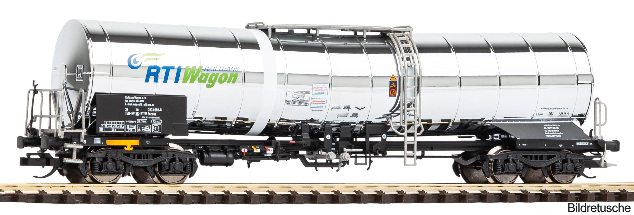 | kotlový vůz stříbrný na přepravu chemikálií s logem „RTI“ |