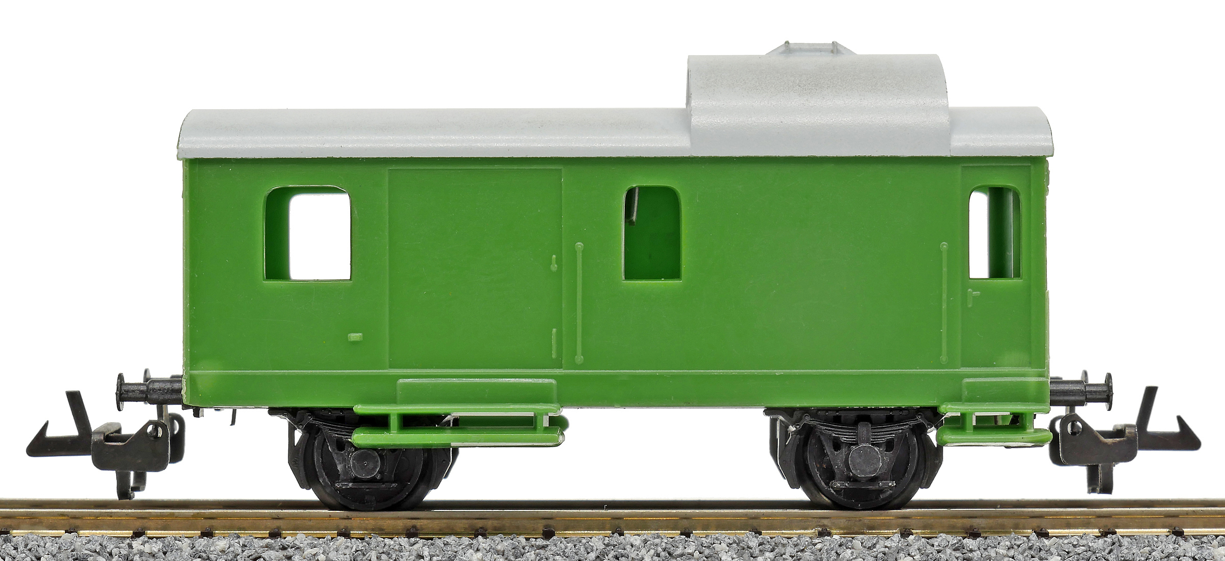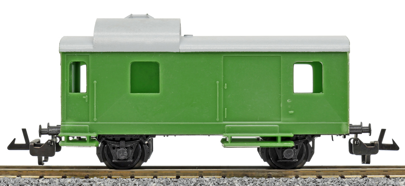 | služební vůz pro nákladní vlaky zelený v barvě plastu s šedou střechou |
