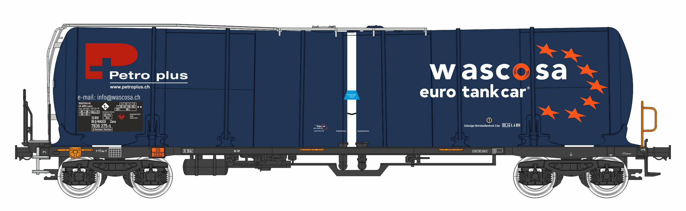 | kotlový vůz tmavě modrý „Wascosa Euro tank car“ a „Petro Plus“ |