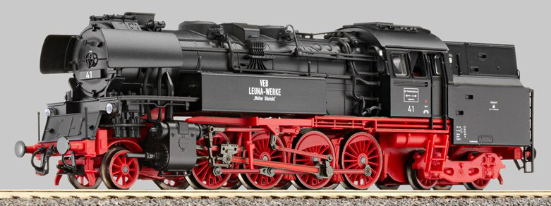 Popis   parní lokomotiva černá s červeným pojezdem a s kouřovými plechy, VEB LEUNA-WERKE