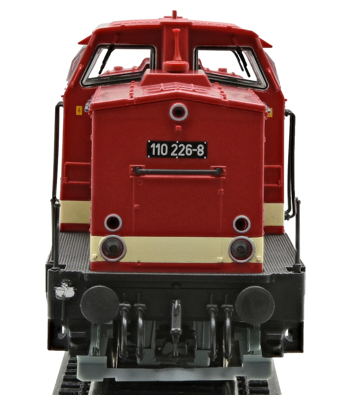 Kód   04593  [Lokomotivy] → [Motorové] → [V 100] → 04593: dieselová lokomotiva červená s krémovým pruhem, černý rám a šedý pojezd