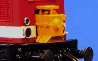 | dieselová lokomotiva červená s bílým proužkem a s pomocným pohonem |