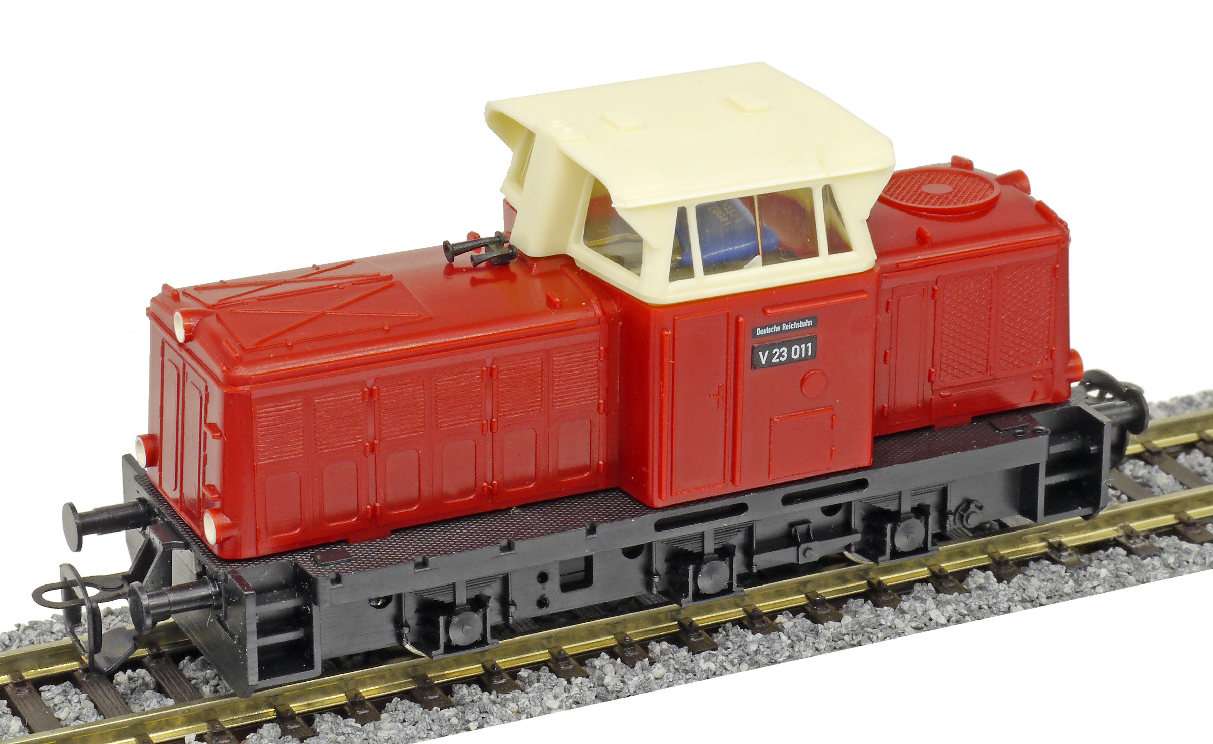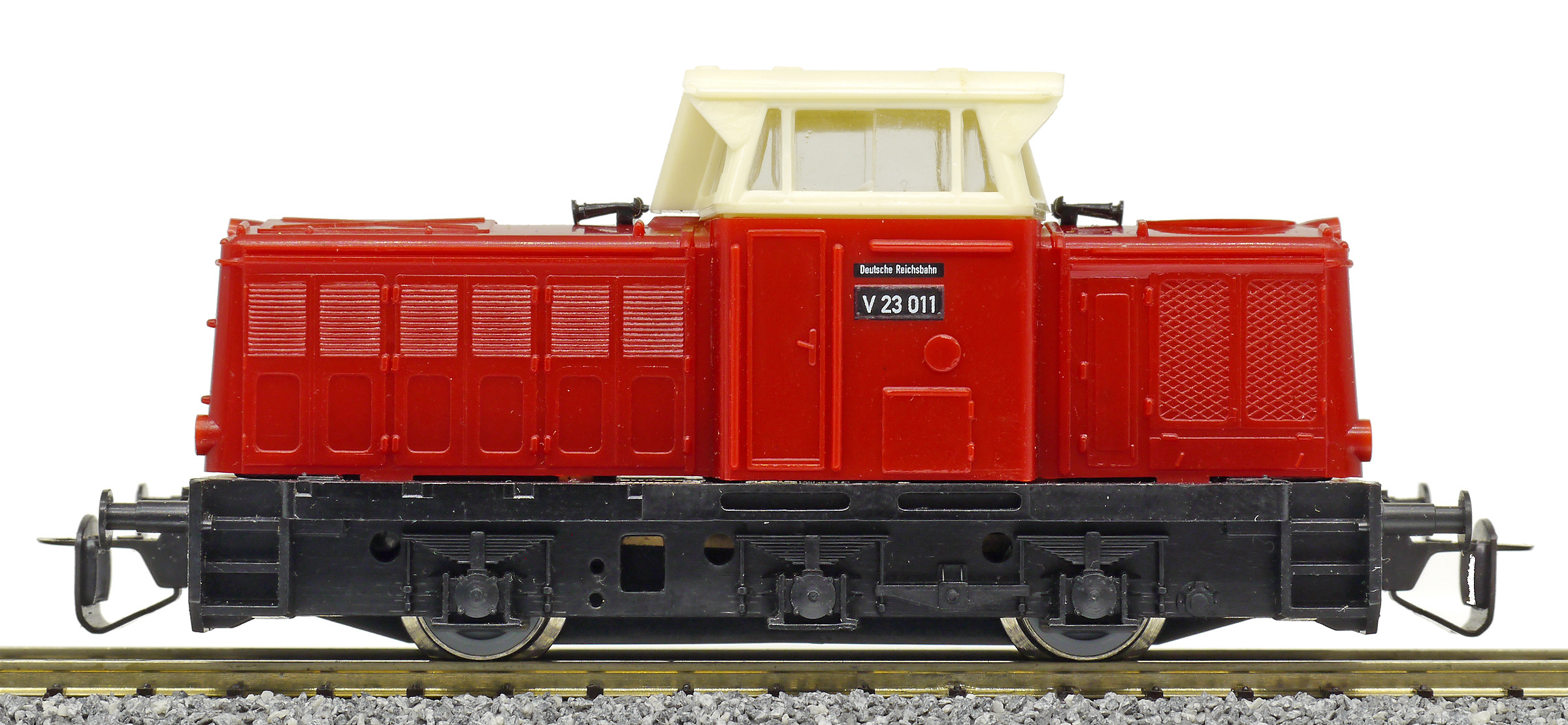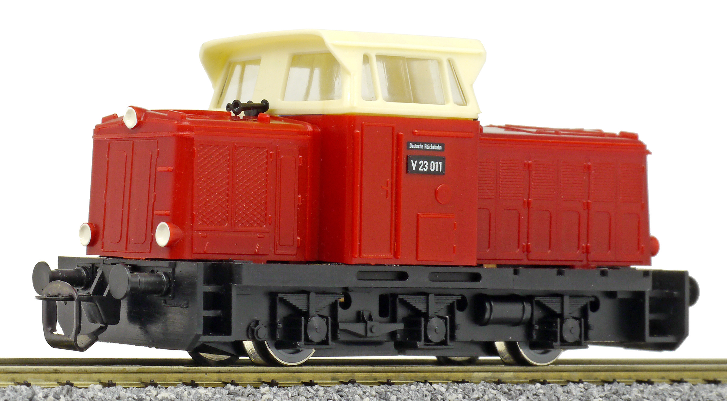 Kód   02611  [Lokomotivy] → [Motorové] → [T334] → 02611: dieselová lokomotiva červená s krémovými pruhy „Chemiekombinates Schwarza“