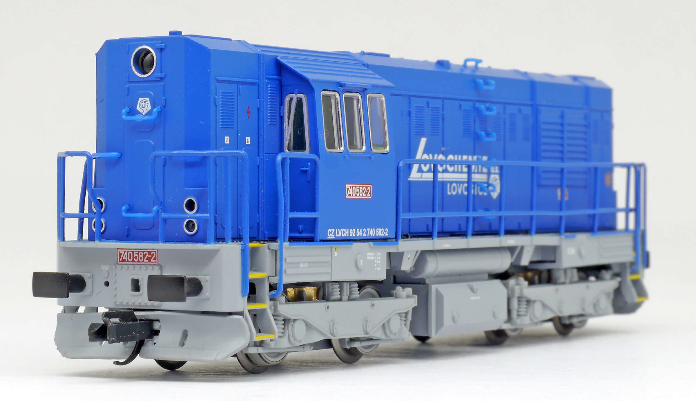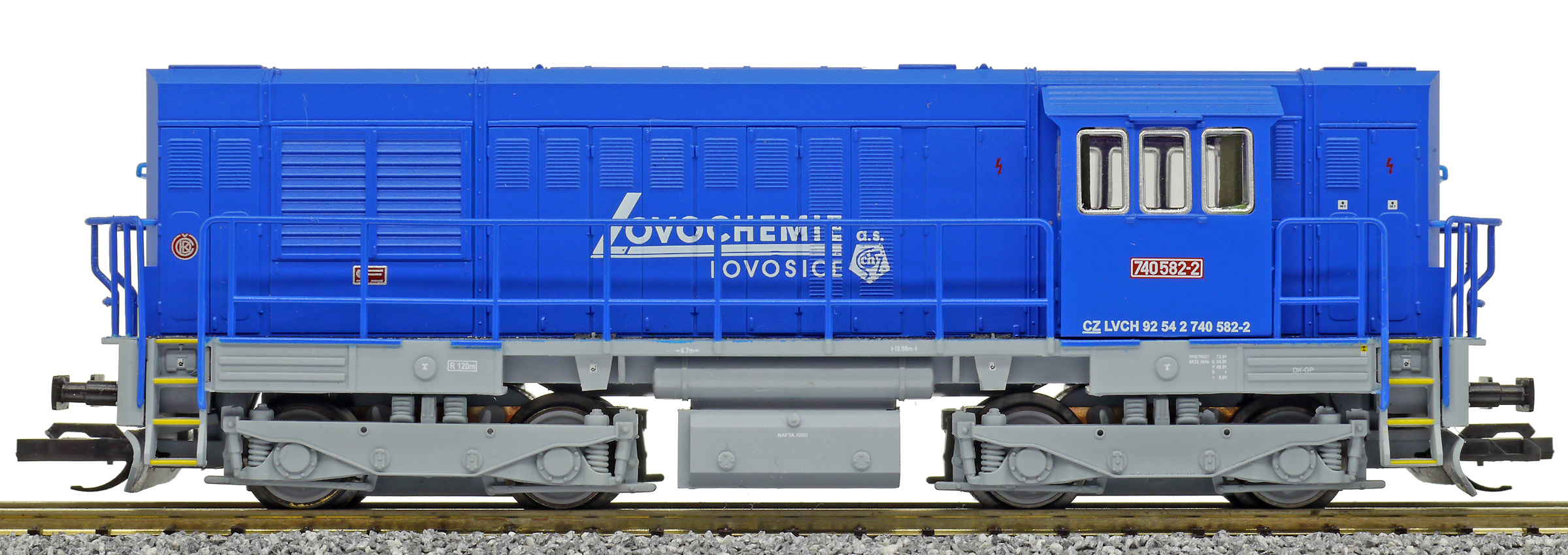 | dieselová lokomotiva modrá s šedým rámem a pojezdem „Lovochemie“ |