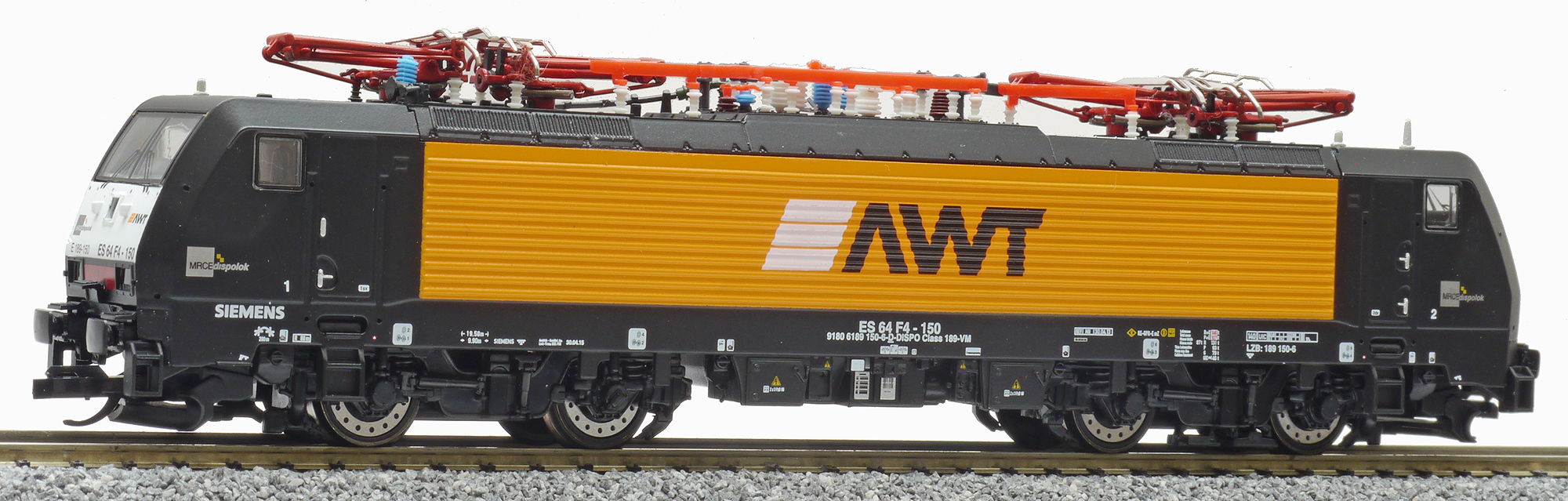 | elektrická lokomotiva černá-oranžová s logem „AWT“ |