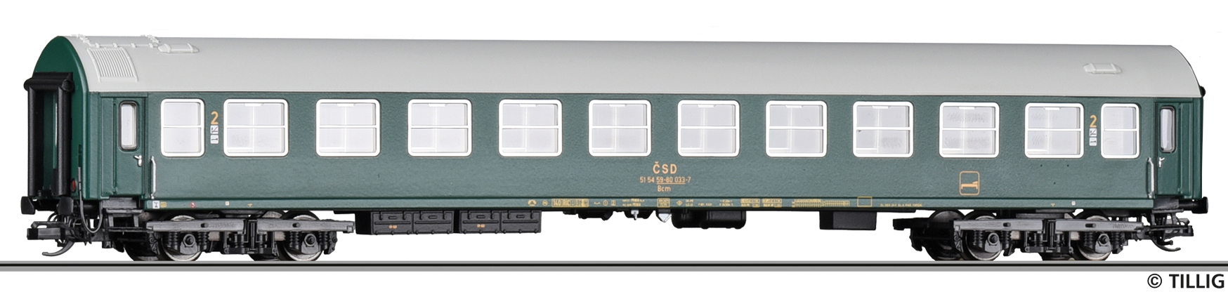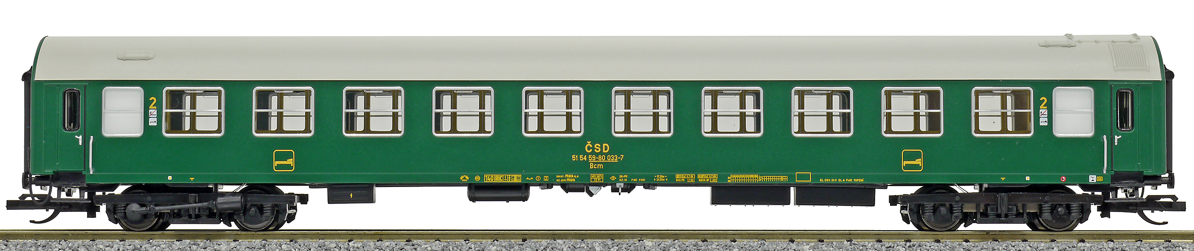 Kód   501590  [Osobní vozy] → [Rychlíkové] → [typ Y] → 501590: rychlíkový vůz zelený s šedou střechou 2. tř.