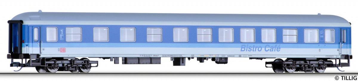 Kód   13685  [Osobní vozy] → [Rychlíkové] → [typ m v barvách InterRegio] → 13685: rychlíkový vůz modrý-bílý Bisto Café 1. tř.