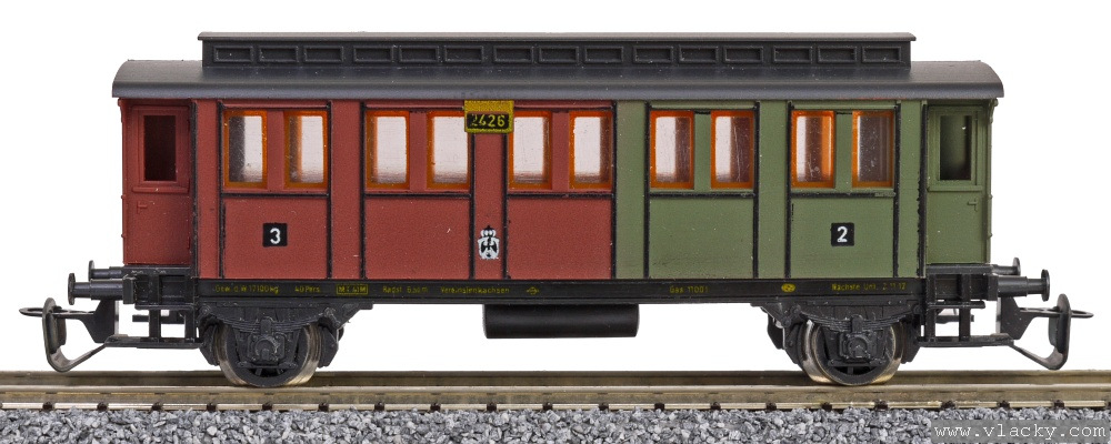 osobní vůz červenohnědý-zelený s černou střechou 3./2. tř.