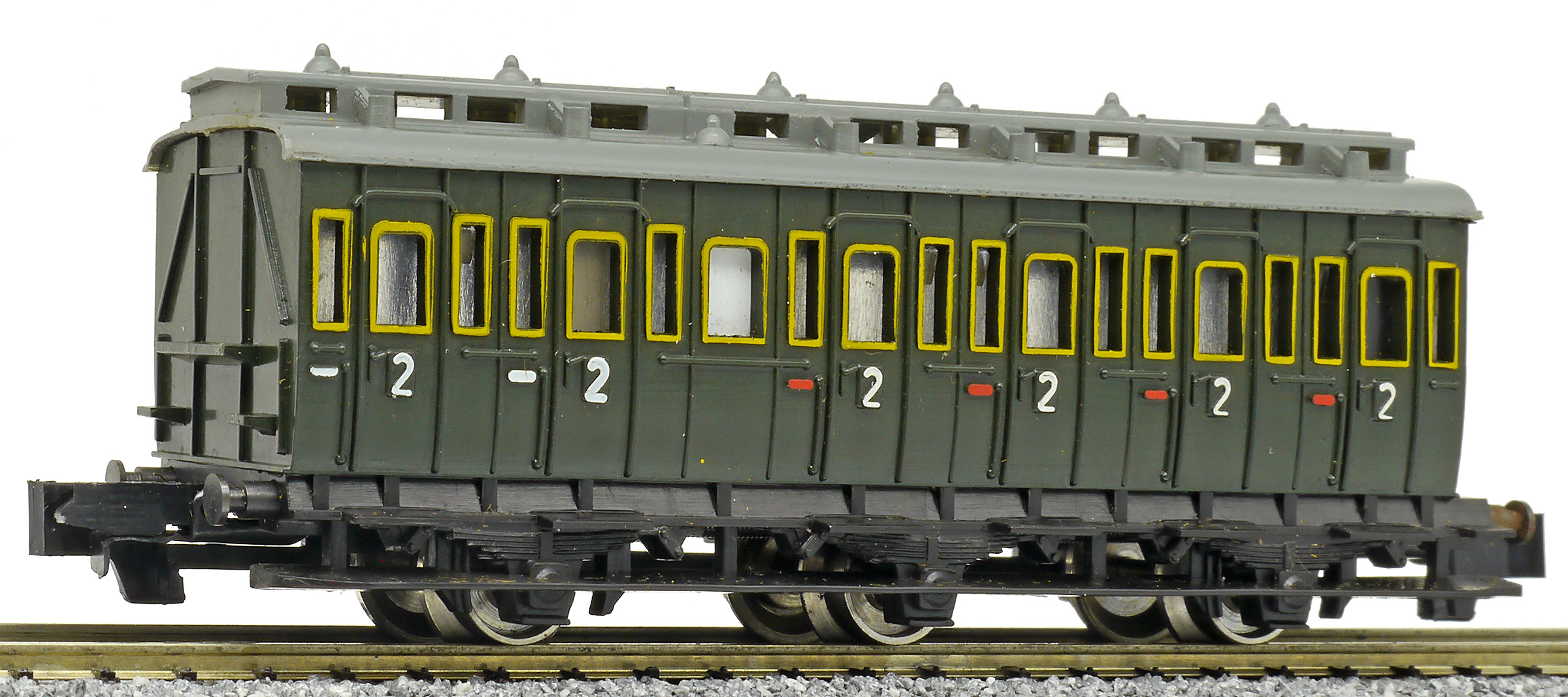 | oddílový osobní vůz zelený s šedou střechou 2. tř. |