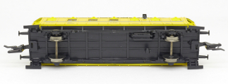 | dílenský vůz žlutý modrým proužkem a šedou střechou |