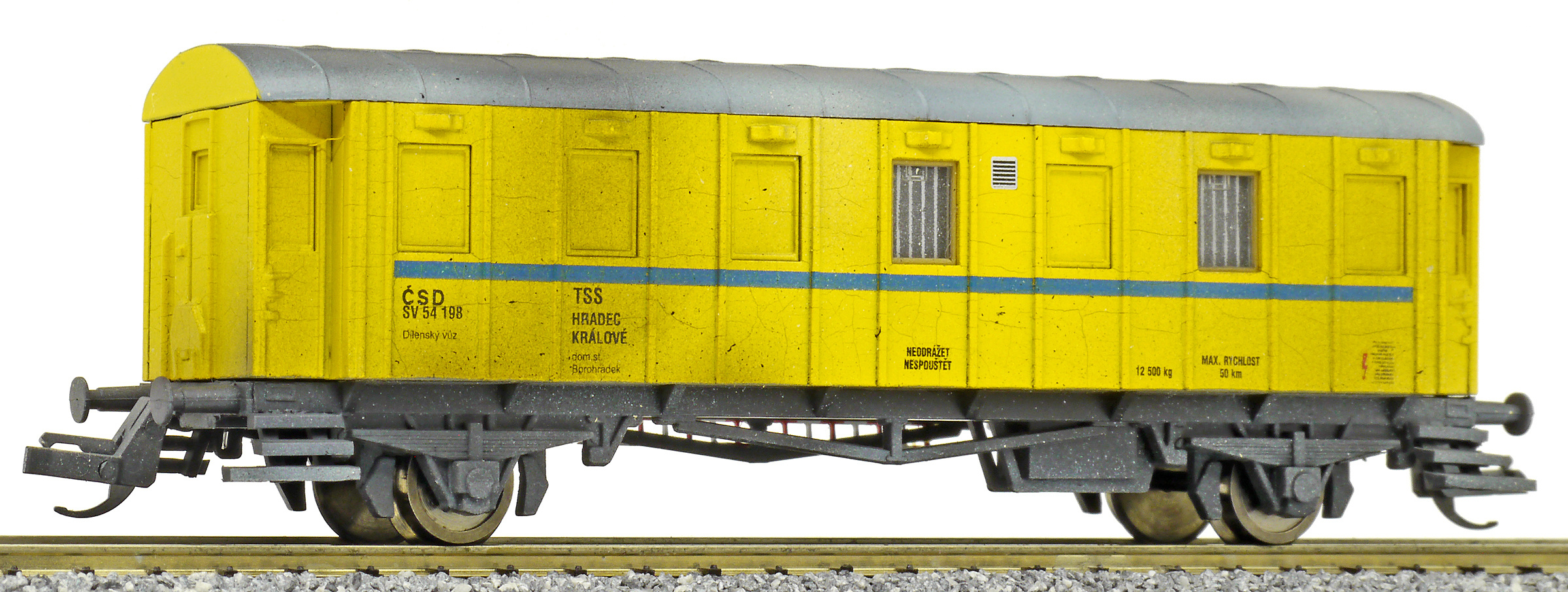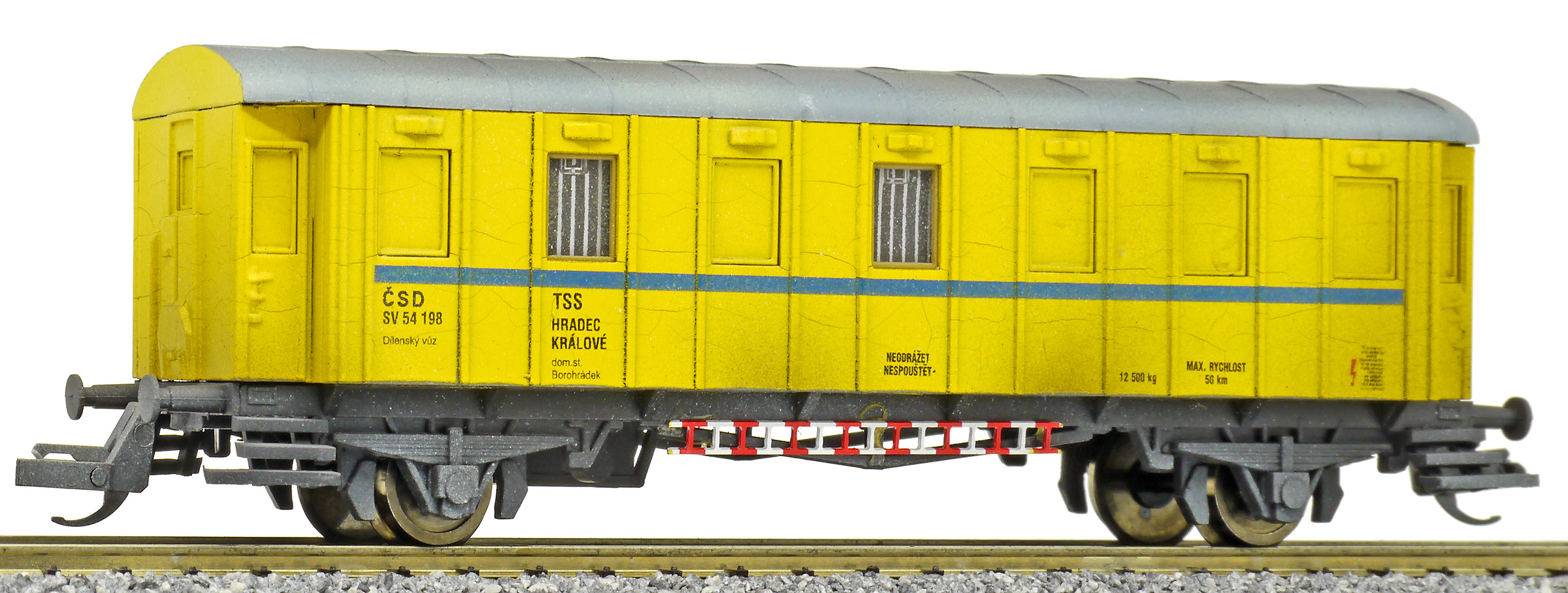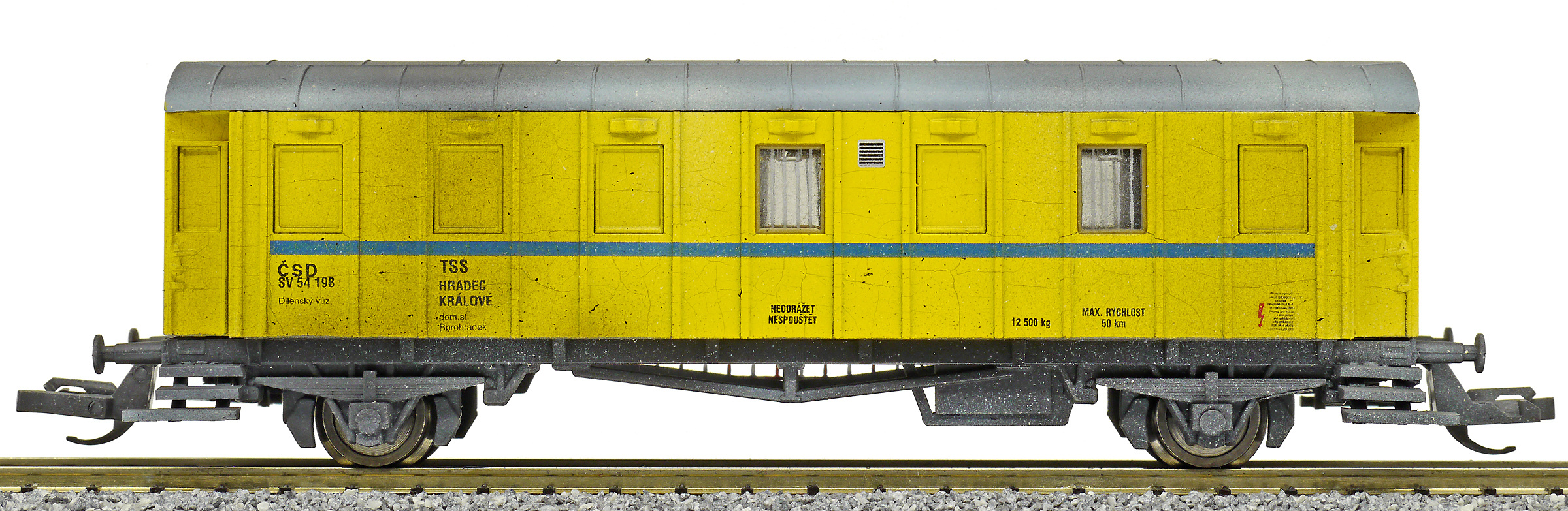 | dílenský vůz žlutý s modrým proužkem a šedou střechou |