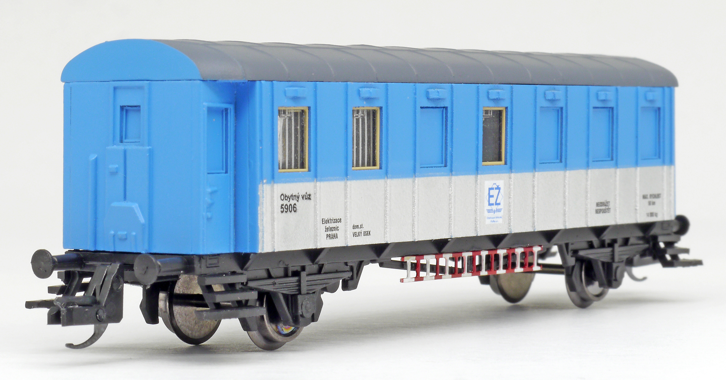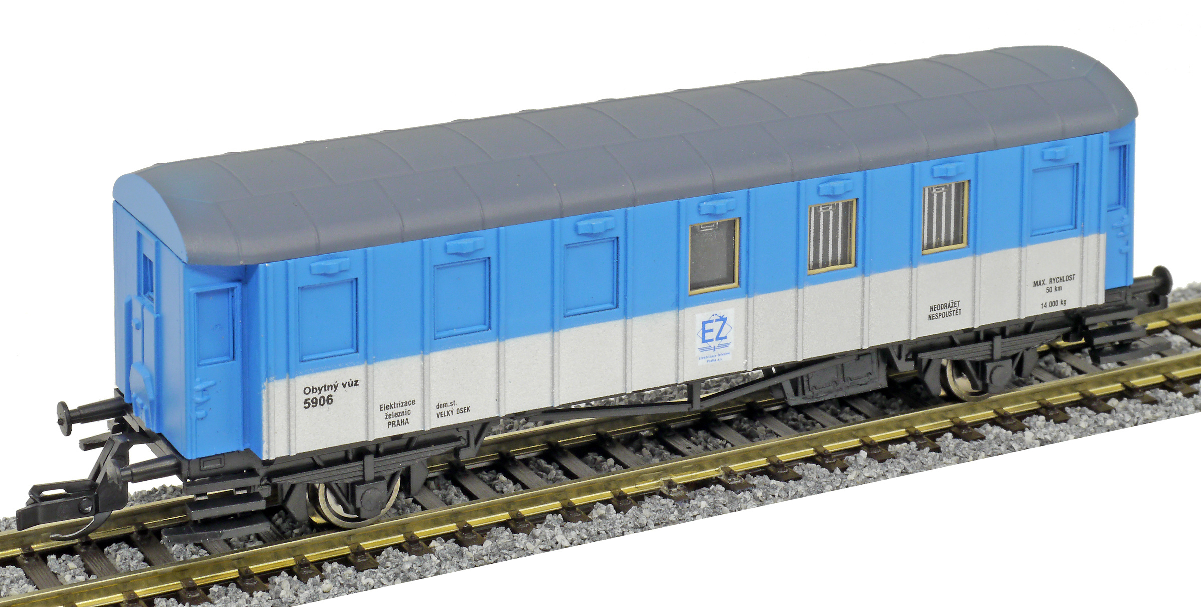 | obytný vůz modrý-stříbrný s šedou střechou „Elektrizace železnic“ |