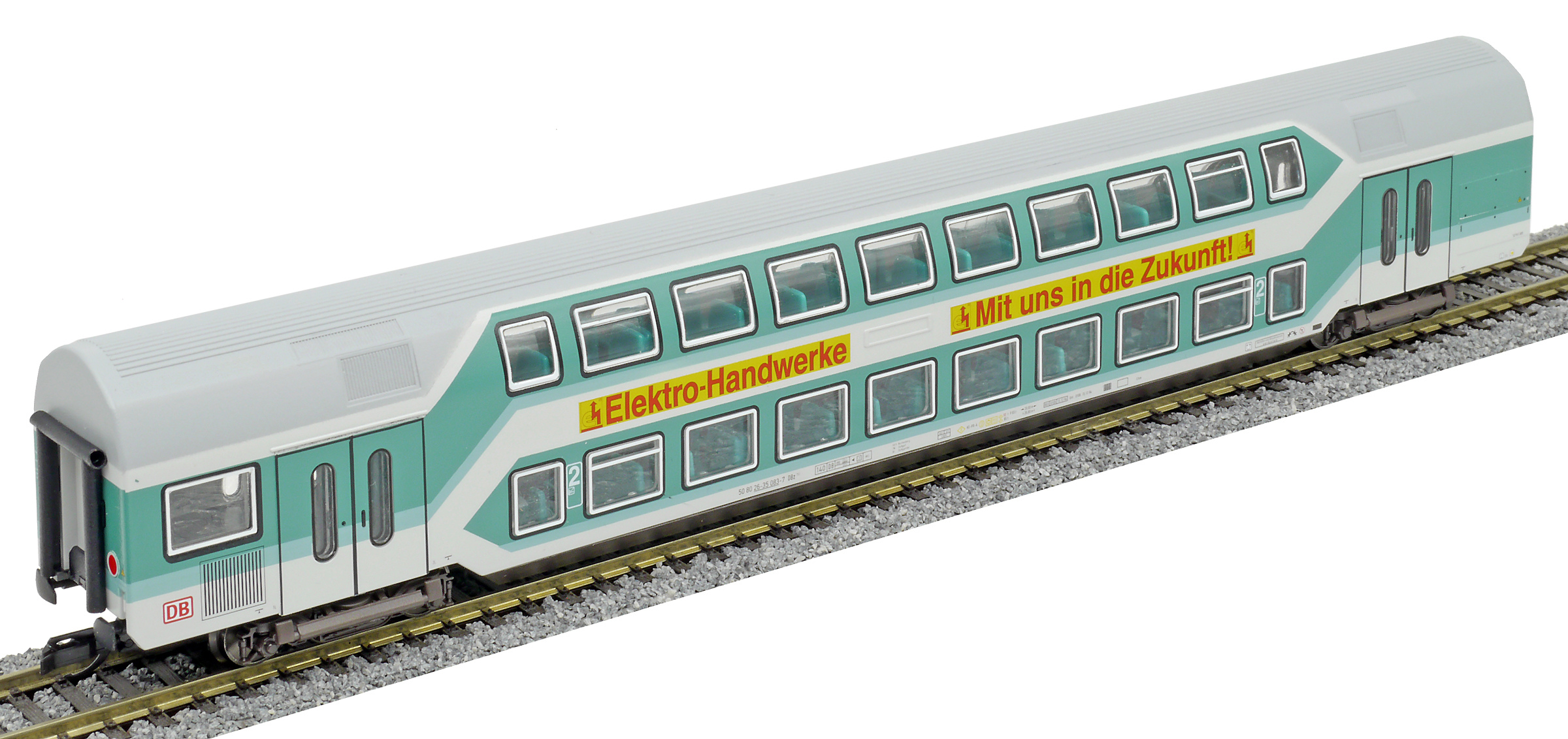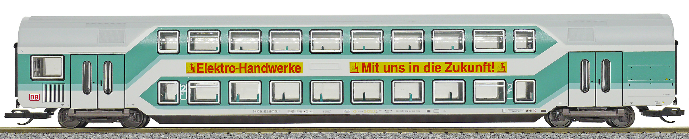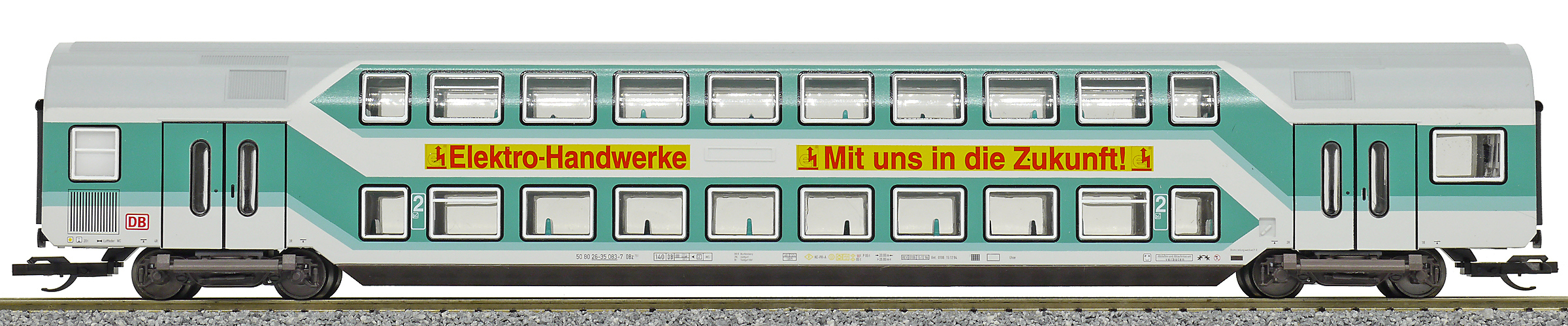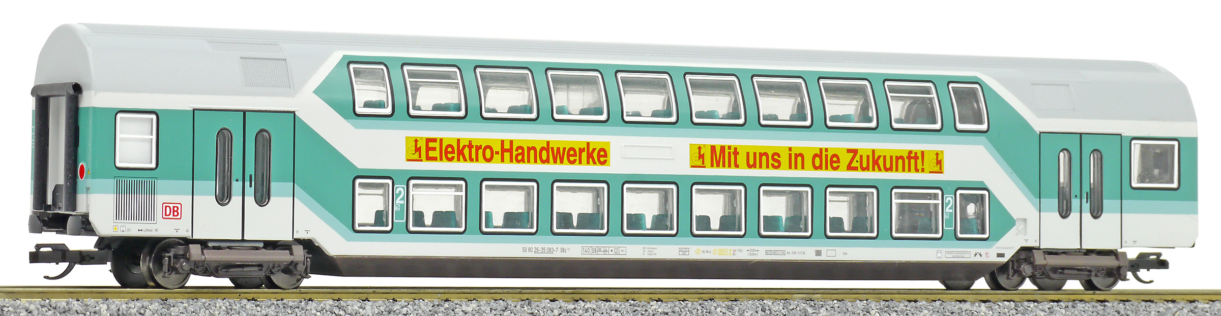 | středový patrový vůz tyrkysový-světle šedý 2. tř. s reklamou |